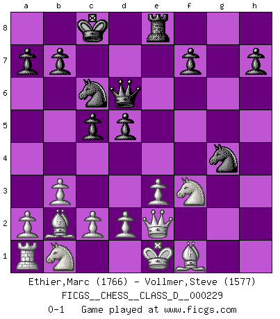 Last move : 0-1 2016 July 19 2:15:31 [Event "FICGS__CHESS__CLASS_D__000229"] [Site "FICGS"] [Date "2016.03.12"] [Round "1"] [White "Ethier,Marc"] [Black "Vollmer,Steve"] [Result "0-1"] [WhiteElo "1766"] [BlackElo "1577"] 1.f4 d5 2.b3 Nf6 3.Bb2 e6 4.Nf3 c5 5.e3 Bd6 6.Rg1 Nc6 7.g4 e5 8.fxe5 Nxg4 9.exd6 Nxh2 10.Rxg7 Bg4 11.Rxg4 Nxg4 12.Bxh8 Qxd6 13.Qe2 O-O-O 14.Bb2 Re8 0-1 This chess game has been lost on time (started : 2016.03.12 0:54:25) Bird's Opening Queenside Castling by player Black (move 13) Player Black won this chess game. Follow this game move after move (download)All Chess players should have a hobby. (Savielly Tartakower) Schach ist wie eine schöne Frau, zu der wir ständig zurückkehren, gleichviel, wie oft sie uns zurückweist. (Anonymous) El arma más poderosa en el Ajedrez, es tener la próxima movida. (David Bronstein) Mais n'est-ce pas déjà le limiter injurieusement que d'appeler les échecs un jeu? N'est-ce pas aussi une science, un art, ou quelque chose qui, comme le cercueil de Mahomet entre ciel et terre, est suspendu entre l'un et l'autre, et qui réunit un nombre incroyable de contraires ? (Stefan Zweig) Computer Science is no more about computers than astronomy is about telescopes. (Edsger W. Dijkstra)