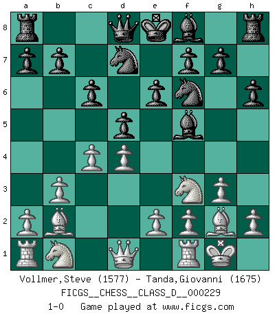 Last move : 1-0 2016 April 21 22:5:40 [Event "FICGS__CHESS__CLASS_D__000229"] [Site "FICGS"] [Date "2016.03.12"] [Round "1"] [White "Vollmer,Steve"] [Black "Tanda,Giovanni"] [Result "1-0"] [WhiteElo "1577"] [BlackElo "1675"] 1.Nf3 d5 2.d4 c6 3.g3 Nf6 4.Bg2 Bf5 5.O-O h6 6.c4 e6 7.b3 Nbd7 8.Bb2 1-0 This chess game has been lost on time (started : 2016.03.12 0:54:25) Reti Opening Kingside Castling by player White (move 5) Player White won this chess game. Follow this game move after move (download)A chess genius has died; a loss for humanity. (Viktor Kortchnoi, about Bobby Fischer's death) Aljechin war kein Nazi. Er war ein Opportunist. Ein schrecklicher Mann. Er liebte Geld über alles und würde für Geld ein Jude, ein Katolik oder ein Protestant werden. (Miguel Najdorf) El Ajedrez es el juego mas altamente simbólico, pero las agresiones estan por lo tanto aún mas francamente representadas en la partida. Tal vez comenzo como un juego de guerra; Algo como la representación de una batalla en miniatura entre las fuerzas de dos reinos. (Karl Meninger) Toutes les manuvres exécutées sur une colonne ouverte ont pour but ultime l'intrusion définitive sur la septième ou la huitième rangée, en plein cur de la position ennemie. (Aaron Nimzovitch) The next best thing to gambling and winning is gambling and loosing. (Nick Dandalos)