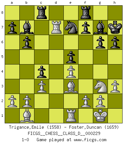 Last move : 1-0 2016 March 21 22:52:41 [Event "FICGS__CHESS__CLASS_D__000229"] [Site "FICGS"] [Date "2016.03.12"] [Round "1"] [White "Trigance,Emile"] [Black "Foster,Duncan"] [Result "1-0"] [WhiteElo "1558"] [BlackElo "1659"] 1.e4 b6 2.d4 Bb7 3.Bd3 g6 4.Be3 Bg7 5.Nf3 h6 6.c3 d6 7.Qc2 e6 8.Nbd2 Ne7 9.O-O Nd7 10.Rfe1 O-O 11.Nf1 e5 12.Ng3 Rc8 13.Qd2 Kh7 14.h3 c5 15.dxe5 Nxe5 16.Nxe5 dxe5 17.Rad1 c4 18.Bb1 Qc7 19.Qd7 Qxd7 20.Rxd7 1-0 Owen defense Kingside Castling by player White (move 9) Kingside Castling by player Black (move 10) Player White won this chess game. Follow this game move after move (download)Before the endgame, the Gods have placed the middle game. (Siegbert Tarrasch) Um dein Spiel zu verbessern musst du zuallererst das Endspiel studieren, denn diese kann unabhängig studiert werden. Die Eröffnung und das Mittelspiel müssen immer in Bezug gesetzt werden zum Endspiel. (José Raúl Capablanca) El Ajedrez es imaginación. (David Bronstein) Seul un grand joueur sait à quel point il joue faiblement. (Xavier Tartacover) If you don't practice you don't deserve to win. (Andre Agassi)