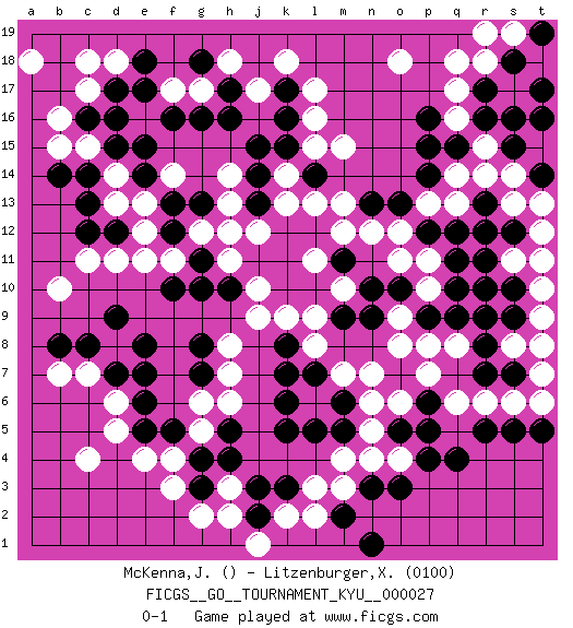 Last move : 0-1 2007 April 3 17:34:38 [Event "FICGS__GO__TOURNAMENT_KYU__000027"] [Site "FICGS"] [Date "2007.03.22"] [Round "1"] [Black "McKenna,James"] [White "Litzenburger,Xavier"] [Result "0-1"] [Rating 2 "0100"] 1.q4 c4 2.r10 q16 3.r17 q17 4.r16 r15 5.s15 s14 6.t16 q14 7.d16 r18 8.s18 s17 9.s16 s19 10.t17 q18 11.t14 s13 12.s12 t13 13.r13 r14 14.q12 r6 15.r5 q6 16.p4 q8 17.t19 r19 18.k3 l17 19.h17 o6 20.k5 n4 21.n3 o4 22.o3 f3 23.g3 f4 24.g4 f17 25.f16 c17 26.d17 d18 27.e18 c18 28.c14 b15 29.b14 c15 30.c16 b16 31.d15 a18 32.k16 d8 33.g7 c11 34.c12 p10 35.r8 d11 36.d12 l6 37.k6 l8 38.k8 l9 39.k11 g17 40.g16 h18 41.e17 j17 42.h16 g12 43.g11 f11 44.f12 e12 45.f13 e13 46.e14 h11 47.g10 j12 48.g13 h12 49.h10 k14 50.j13 k13 51.k12 h13 52.j14 h14 53.j15 f14 54.j11 m15 55.l14 l15 56.k15 l13 57.k17 k18 58.g18 s6 59.s5 t9 60.q9 p8 61.p9 o9 62.q10 k9 63.l7 m7 64.k7 j10 65.k10 j9 66.f10 e11 67.l12 m13 68.m6 n7 69.o10 m12 70.n9 o8 71.r9 p11 72.m11 l11 73.l10 m10 74.m9 l11 75.n10 o12 76.e7 d6 77.d7 c7 78.f5 d5 79.e5 e4 80.e6 m4 81.l5 m3 82.m2 l2 83.n1 l3 84.p12 o11 85.q11 s11 86.s10 t12 87.r12 t10 88.t8 s8 89.s7 t7 90.r7 p13 91.o13 n12 92.n13 d13 93.c13 d14 94.e15 l16 95.p14 q13 96.p15 g2 97.q15 t11 98.p16 o18 99.t5 t6 100.s9 t8 101.o5 k2 102.j3 n5 103.p5 n6 104.p6 p7 105.r11 h8 106.g8 h3 107.h4 h2 108.m5 h7 109.j2 j1 110.c8 h6 111.h5 g6 112.d9 g5 113.e8 b7 114.b8 b10 0-1 Comment by player 1 : James McKenna : i know its easy win for you im not stupid Comment by player 2 : Xavier Litzenburger : easy win for me =) Here are the names of the openings (joseki) played in the four corners : Corner q16 : q16 r17 Hoshi (Hwajeom, Seongjeom, Xingwei`) 4-4 Point. The star or hoshi (4-4) point, emphasizing influence at the potential expense of territory. Corner q4 : q4 r6 Hoshi (Hwajeom, Seongjeom, Xingwei`) 4-4 Point. The star or hoshi (4-4) point, emphasizing influence at the potential expense of territory. Ikken Kakari (Hankan Keolch'im, Yi Gua`jiao~, 1-Space Low Approach). White 2 is the standard approach move to the 4-4. Player White won this Go (weiqi, baduk) game. Follow this game move after move (download)Grab the border points between two moyos. (Anonymous) It's not enough to succeed. Others must fail. (Gore Vidal)