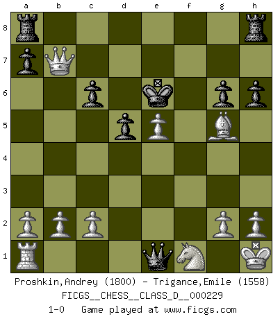 Last move : 1-0 2016 April 3 18:46:15 [Event "FICGS__CHESS__CLASS_D__000229"] [Site "FICGS"] [Date "2016.03.12"] [Round "1"] [White "Proshkin,Andrey"] [Black "Trigance,Emile"] [Result "1-0"] [WhiteElo "1800"] [BlackElo "1558"] 1.e4 c6 2.d4 d5 3.e5 Bf5 4.Nf3 e6 5.Be2 Ne7 6.O-O Nd7 7.Nbd2 Bg6 8.Nh4 h6 9.Nxg6 Nxg6 10.f4 Be7 11.f5 Ngf8 12.Bg4 Bg5 13.fxe6 fxe6 14.Bxe6 Qb6 15.Qh5+ g6 16.Bxd7+ Kd8 17.Qh3 Qxd4+ 18.Kh1 Qh4 19.Qb3 Kc7 20.Rf7 Qe1+ 21.Nf1 Nxd7 22.Rxd7+ Kxd7 23.Qxb7+ Ke6 24.Bxg5 1-0 Caro-Kann : Advance variation Kingside Castling by player White (move 6) Player White won this chess game. Follow this game move after move (download)I like to say that Bobby Fischer was the greatest player ever. But what made Fischer a genius was his ability to blend an American freshness and pragmatism with Russian ideas about strategy. (Bruce Pandolfini) Dass jemand wie Surab Asmaiparaschwili, der selbst Elopunkte gekauft hat , Vize-Präsident der Fide werden konnte, sagt schon einges über den Zustand dieser Organisation aus. (Joel Lautier) Todos los Maestros de Ajedrez fueron un día unos principiantes. (Chernev) L'ordinateur a tué l'originalité. Il n'y a plus guère d'aventures sur l'échiquier. (Jacob Murray) The general who wins the battle makes many calculations in his temple before the battle is fought. The general who loses makes but few calculations beforehand. (Sun Tzu)