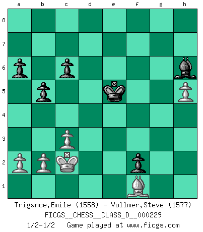Last move : 1/2-1/2 2016 March 23 20:20:25 [Event "FICGS__CHESS__CLASS_D__000229"] [Site "FICGS"] [Date "2016.03.12"] [Round "1"] [White "Trigance,Emile"] [Black "Vollmer,Steve"] [Result "1/2-1/2"] [WhiteElo "1558"] [BlackElo "1577"] 1.e4 d6 2.d4 Nf6 3.Nc3 g6 4.Bg5 Bg7 5.Qd2 O-O 6.O-O-O Nc6 7.f3 e5 8.dxe5 Nxe5 9.f4 Nc6 10.e5 dxe5 11.Qxd8 Rxd8 12.Rxd8+ Nxd8 13.fxe5 Ng4 14.Nf3 Nc6 15.Bb5 Ncxe5 16.Re1 Be6 17.Nxe5 Nxe5 18.Bf4 f6 19.Rd1 Kf8 20.Ne4 Ke7 21.Nc5 Rb8 22.Nxe6 Kxe6 23.Bxe5 Bh6+ 24.Kb1 Kxe5 25.Rd7 c6 26.Bd3 Bf4 27.g3 Ke6 28.Rxh7 Be3 29.Rh4 f5 30.Rh7 Bc5 31.Bc4+ Ke5 32.Rd7 g5 33.Kc1 f4 34.gxf4+ gxf4 35.Rd1 Be3+ 36.Kb1 Rh8 37.Rh1 b5 38.Bd3 f3 39.h4 f2 40.h5 Rg8 41.Rf1 Rg1 42.c3 Bh6 43.Kc2 Rxf1 44.Bxf1 a6 1/2-1/2 Pirc : Byrne variation Kingside Castling by player Black (move 5) Queenside Castling by player White (move 6) This chess game ended in a draw. Follow this game move after move (download)Capture of the adverse King is the ultimate but not the first object of the game. (William Steinitz) Schon mancher Spieler hat aufgegeben, um zu vermeiden, daß er eine Figur verliert. (Savielly Grigorievitsch Tartakower) En el Ajedrez, tal como en la vida, las bendiciones de hoy pueden ser el veneno del mañana. (Assaic) Vouloir jouer aux échecs contre soi-même est aussi paradoxal que vouloir marcher sur son ombre. (Stefan Zweig) It's only after you lost everything, Tyler says, that you're free to do anything. (Chuck Palahniuk, Fight Club)