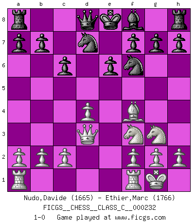 Last move : 1-0 2016 June 13 10:42:33 [Event "FICGS__CHESS__CLASS_C__000232"] [Site "FICGS"] [Date "2016.03.12"] [Round "1"] [White "Nudo,Davide"] [Black "Ethier,Marc"] [Result "1-0"] [WhiteElo "1665"] [BlackElo "1766"] 1.e4 c6 2.d4 d5 3.Nc3 dxe4 4.Nxe4 Bf5 5.Ng3 Bg6 6.Nf3 Nd7 7.Bd3 e6 8.O-O Ngf6 9.Bf4 Bxd3 10.Qxd3 1-0 This chess game has been lost on time (started : 2016.03.12 17:45:41) Caro-Kann : Classical variation Kingside Castling by player White (move 8) Player White won this chess game. Follow this game move after move (download)I had a toothache during the first game. In the second game I had a headache. In the third game it was an attack of rheumatism. In the fourth game, I wasn't feeling well. And in the fifth game? Well, must one have to win every game ? (Siegbert Tarrasch) Du weisst es gibt ein Problem mit Computern und Fernschach, wenn jeder eine Rating von 2450 hat. (John Christen Knudsen) Debemos de asegurarnos de que el Ajedrez no se convierta en un lenguaje muerto, muy interesante, pero tan solo para un grupo muy pequeño. (Sytze Faber) Des combinaisons [dans le jeu d'échecs] pareilles à des mélodies. Je crois entendre pour ainsi dire la musique des coups... (Vladimir Nabokov) Always be a first-rate version of yourself, instead of a second-rate version of somebody else. (Judy Garland)