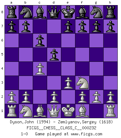 Last move : 1-0 2016 April 21 22:5:40 [Event "FICGS__CHESS__CLASS_C__000232"] [Site "FICGS"] [Date "2016.03.12"] [Round "1"] [White "Dyson,John"] [Black "Zemlyanov,Sergey"] [Result "1-0"] [WhiteElo "1994"] [BlackElo "1618"] 1.Nf3 d5 2.c4 c6 3.e3 1-0 This chess game has been lost on time (started : 2016.03.12 17:45:41) Reti Opening Player White won this chess game. Follow this game move after move (download)Chess holds its master in its own bonds, shackling the mind and brain so that the inner freedom of the very strongest must suffer. (Albert Einstein) Der vorletzte Fehler gewinnt. (Savielly Grigorievitsch Tartakower) No soy una persona materialista y por eso, no resiento la falta o pérdida del dinero. La ausencia de cosas mundanas carece de importancia. Ya que el Ajedrez es una forma en la que puedo ser tan materialista como yo desee sin tener la necesidad de vender mi alma. (Jamie Walter Adams) Vous n'êtes pas toujours obligé de jouer le meilleur coup. Un coup doit être actif, entreprenant, correct et beau ! (David Bronstein) The right perception of any matter and a misunderstanding of the same matter do not wholly exclude each other. (Kafka's the trial)