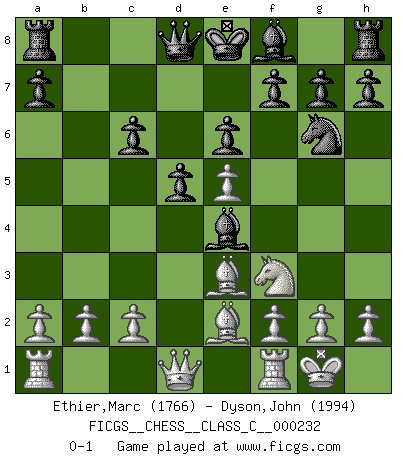 Last move : 0-1 2016 July 26 3:59:33 [Event "FICGS__CHESS__CLASS_C__000232"] [Site "FICGS"] [Date "2016.03.12"] [Round "1"] [White "Ethier,Marc"] [Black "Dyson,John"] [Result "0-1"] [WhiteElo "1766"] [BlackElo "1994"] 1.e4 c6 2.d4 d5 3.e5 Bf5 4.Nf3 e6 5.Be2 c5 6.Be3 cxd4 7.Nxd4 Ne7 8.Nd2 Nbc6 9.N2f3 Be4 10.O-O Ng6 11.Nxc6 bxc6 0-1 Caro-Kann : Advance variation Kingside Castling by player White (move 10) Player Black won this chess game. Follow this game move after move (download)A strong memory, concentration, imagination, and a strong will is required to become a great Chess player. (Bobby Fischer) Früher wurde jeder komplizierte Zug, jedes interessante Opfer mit großem Beifall und Enthusiasmus aufgenommen. Heute schaltet man einfach seinen Fritz an, und man kann sehen, was los ist, ob der Zug geht oder nicht. (Vladimir Kramnik) Bobby es el jugador de Ajedrez mas fino que este país jamás haya producido. Su memoria para las movidas, su brillantez en soñar combinaciones y su feróz determinación por la victoria son algo extraño. (John Collins) Les erreurs sont comme les malheurs, elles n'arrivent jamais seules. (Siegbert Tarrasch) I know the human being and fish can coexist peacefully. (George W. Bush, Saginaw sept. 29, 2000)