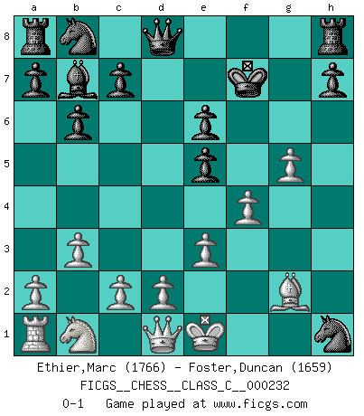 Last move : 0-1 2016 July 18 14:14:58 [Event "FICGS__CHESS__CLASS_C__000232"] [Site "FICGS"] [Date "2016.03.12"] [Round "1"] [White "Ethier,Marc"] [Black "Foster,Duncan"] [Result "0-1"] [WhiteElo "1766"] [BlackElo "1659"] 1.f4 b6 2.b3 Bb7 3.Bb2 e6 4.e3 Nf6 5.Nf3 g6 6.g4 Bg7 7.g5 Nh5 8.Bxg7 Nxg7 9.Bg2 d6 10.h4 Nf5 11.h5 Ng3 12.hxg6 Nxh1 13.gxf7+ Kxf7 14.Ne5+ dxe5 0-1 This chess game has been lost on time (started : 2016.03.12 17:45:41) Bird's Opening Player Black won this chess game. Follow this game move after move (download)The passion for playing Chess is one of the most unaccountable in the world. (H.G. Wells) Ich erzeugte keinen Neid, da mich die Schachspieler als Musiker und die Musiker als Schachspieler betrachteten. (Mark Taimanov) Me gusta decir que Bobby Fischer fue el mejor jugador que jamás haya existido. Pero lo que hizo de Fischer un genio, fue su habilidad de mezclar una frescura y pragmatismo Americano con ideas Rusas acerca de la estrategia. (Bruce Pandolfini) Lorsque vous vous retrouvez devant une position atroce, ne tendez pas un ultime piège dérisoire avec l'intention d'abandonner si l'adversaire le déjoue ! Faites-vous plutôt un devoir de résister comme si votre vie en dépendait. Jouez le coup qui vous déplairait au centuple si vous étiez dans la peau de votre tortionnaire ! If you work for a living, why do you kill yourself working ? (Tuco to a chicken in The Good, The Bad and The Ugly)