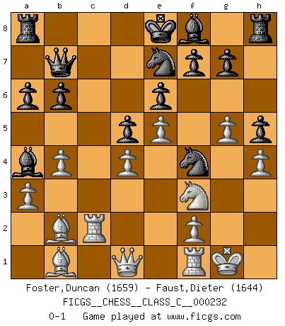 Last move : 0-1 2016 April 3 17:2:31 [Event "FICGS__CHESS__CLASS_C__000232"] [Site "FICGS"] [Date "2016.03.12"] [Round "1"] [White "Foster,Duncan"] [Black "Faust,Dieter"] [Result "0-1"] [WhiteElo "1659"] [BlackElo "1644"] 1.e4 e6 2.d4 d5 3.e5 c5 4.c3 Bd7 5.Nf3 Nc6 6.a3 Nge7 7.b4 cxd4 8.cxd4 Nf5 9.Bb2 Qb6 10.g4 Nfe7 11.Nc3 a6 12.Na4 Qc7 13.h4 h5 14.g5 Ng6 15.Rc1 b6 16.Bd3 Nf4 17.O-O Qb7 18.Bb1 Ne7 19.Rc2 Bxa4 0-1 French : Advance variation Kingside Castling by player White (move 17) Player Black won this chess game. Follow this game move after move (download)It is the aim of the modern school, not to treat every position according to one general law, but according to the principle inherent in the position. (Richard Reti) Das Spiel gibt uns die Genugtuung, die das Leben uns versagt. (Emanuel Lasker) Te sientas frente a un tablero y repentinamente tu corazón brinca. Tu mano tiembla al tomar una pieza y moverla. Pero lo que el Ajedrez te enseña es que tu debes permanecer ahí con calma y pensar de que si realmente es una buena idea o de que si hay otras ideas mejores. (Stanley Kubrick) Psychologiquement, tu dois avoir confiance en toi même, mais cette confiance doit être basée sur des faits. (Robert Fischer) Excelling at chess has long been considered a symbol of more general intelligence. That is an incorrect assumption in my view, as pleasant as it might be. But for the purposes of argument and investigation, chess is, in Russkin-Gutman's words, 'an unparalleled laboratory, since both the learning process and the degree of ability obtained can be objectified and quantified, providing an excellent comparative framework on which to use rigorous analytical techniques.' (The Chess Master and the Computer, by Garry Kasparov - 2010)