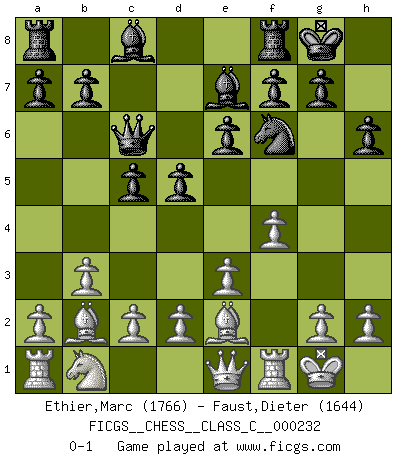 Last move : 0-1 2016 July 23 14:42:24 [Event "FICGS__CHESS__CLASS_C__000232"] [Site "FICGS"] [Date "2016.03.12"] [Round "1"] [White "Ethier,Marc"] [Black "Faust,Dieter"] [Result "0-1"] [WhiteElo "1766"] [BlackElo "1644"] 1.f4 e6 2.Nf3 Nf6 3.b3 d5 4.Bb2 h6 5.e3 Be7 6.Be2 c5 7.O-O Nc6 8.Ne5 Qc7 9.Qe1 O-O 10.Nxc6 Qxc6 0-1 This chess game has been lost on time (started : 2016.03.12 17:45:41) Bird's Opening Kingside Castling by player White (move 7) Kingside Castling by player Black (move 9) Player Black won this chess game. Follow this game move after move (download)After black's reply to 1.e4 with 1..e5, leaves him always trying to get into the game. (Howard Staunton) Habe Mut, dich deines eigenen Verstandes zu bedienen. (Immanuel Kant) ¿Que sería del Ajedrez sin errores graciosos?. (Kurt Richter) Les échecs, c'est l'imagination. (David Bronstein) If we knew what we were doing, we would not call it research. (Albert Einstein)