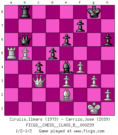 Last move : 1/2-1/2 2016 June 24 1:57:52 [Event "FICGS__CHESS__CLASS_B__000239"] [Site "FICGS"] [Date "2016.03.12"] [Round "1"] [White "Cirulis,Ilmars"] [Black "Carrizo,Jose"] [Result "1/2-1/2"] [WhiteElo "1973"] [BlackElo "2039"] 1.b4 d5 2.Bb2 Nf6 3.a3 Bf5 4.e3 e6 5.Nf3 Nbd7 6.c4 Be7 7.c5 c6 8.Be2 h6 9.O-O O-O 10.d4 Qc7 11.Nfd2 a5 12.Nc3 b6 13.Na4 axb4 14.axb4 Qb7 15.Qb3 bxc5 16.Nxc5 Nxc5 17.dxc5 Ne4 18.Nxe4 Bxe4 19.Rfc1 Rxa1 20.Rxa1 Rb8 21.Ra4 Bxc5 22.Bxg7 Qc7 23.Bc3 Bd6 24.g3 c5 25.b5 Be5 26.f4 Bxc3 27.Qxc3 c4 28.Ra5 Qb6 1/2-1/2 Polish (Sokolsky) opening Kingside Castling by player White (move 9) Kingside Castling by player Black (move 9) This chess game ended in a draw. Follow this game move after move (download)All I want to do, ever, is just play Chess. (Bobby Fischer) Viele Opfer benötigen überhaupt keine konkrete Berechnung. Es genügt sich die entstehende Position kurz vorzustellen, um uns davon zu überzeugen, dass das Opfer korrekt ist. (Mikhail Nekhemyevich Tal) El Ajedrez expande y enriquece tu mente. (Saudin Robovic) En blitz, le Cavalier l'emporte sur le Fou. (Vlastimil Hort) The modern world has divided itself into Conservatives and Progressives. The business of Progressives is to go on making mistakes. The business of the Conservatives is to prevent the mistakes from being corrected. (G.K. Chesterton)