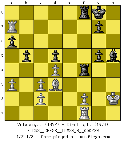 Last move : 1/2-1/2 2016 April 13 21:15:21 [Event "FICGS__CHESS__CLASS_B__000239"] [Site "FICGS"] [Date "2016.03.12"] [Round "1"] [White "Velasco,Jose Maria"] [Black "Cirulis,Ilmars"] [Result "1/2-1/2"] [WhiteElo "1892"] [BlackElo "1973"] 1.d4 a6 2.e4 e6 3.Nf3 d5 4.Nc3 Bb4 5.exd5 exd5 6.Bd3 Nf6 7.O-O O-O 8.a3 Bxc3 9.bxc3 Bg4 10.Re1 Nc6 11.h3 Bh5 12.Bf4 Qd7 13.Rb1 b5 14.g4 Nxg4 15.hxg4 Qxg4+ 16.Bg3 f5 17.Qd2 f4 18.Nh2 Qg5 19.Re6 h6 20.Rxc6 fxg3 21.Qxg5 gxh2+ 22.Kxh2 hxg5 23.Rf1 Rf4 24.Rxc7 Raf8 25.Ra7 1/2-1/2 Queen's pawn Kingside Castling by player White (move 7) Kingside Castling by player Black (move 7) This chess game ended in a draw. Follow this game move after move (download)The laws of Chess do not permit a free choice: you have to move whether you like it or not. (Emanuel Lasker) Taktik ist was man tun muß, wenn etwas zu tun ist. Strategie ist was man tun muß, wenn nichts zu tun ist. (Savielly Grigorievitsch Tartakower) Yo he agregado estos principios a la ley: pongan los Caballos en acción antes de que los dos Alfiles sean desarrollados. (Emanuel Lasker) Les sacrifices démontrent seulement que quelqu'un a gaffé. (Savielly Tartacover) You cannot beat a roulette table unless you steal money from it. (Albert Einstein)