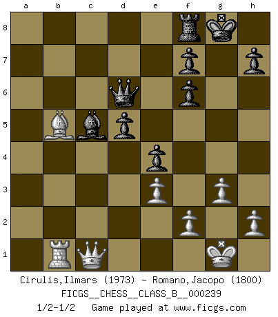Last move : 1/2-1/2 2016 June 8 13:52:9 [Event "FICGS__CHESS__CLASS_B__000239"] [Site "FICGS"] [Date "2016.03.12"] [Round "1"] [White "Cirulis,Ilmars"] [Black "Romano,Jacopo"] [Result "1/2-1/2"] [WhiteElo "1973"] [BlackElo "1800"] 1.b4 e5 2.a3 d5 3.Bb2 Bd6 4.e3 Nf6 5.c4 c6 6.cxd5 cxd5 7.Nf3 Nbd7 8.Be2 a6 9.Qb3 O-O 10.d3 Qe7 11.O-O b5 12.Nbd2 Nb6 13.Qa2 a5 14.Qb1 axb4 15.axb4 Na4 16.d4 e4 17.Ne5 Bd7 18.Nxd7 Qxd7 19.Nb3 Bxb4 20.Rc1 Rac8 21.Nc5 Nxc5 22.dxc5 Rxc5 23.Bxf6 Rxc1+ 24.Qxc1 gxf6 25.Rb1 Qd6 26.Bxb5 Bc5 27.g3 1/2-1/2 Polish (Sokolsky) opening Kingside Castling by player Black (move 9) Kingside Castling by player White (move 11) This chess game ended in a draw. Follow this game move after move (download)A Chess game is a dialogue, a conversation between a player and his opponent. Each move by the opponent may contain threats or be a blunder, but a player cannot defend against threats or take advantage of blunders if he does not first ask himself: What is my opponent planning after each move ? (Bruce A. Moon) Aljechin war kein Nazi. Er war ein Opportunist. Ein schrecklicher Mann. Er liebte Geld über alles und würde für Geld ein Jude, ein Katolik oder ein Protestant werden. (Miguel Najdorf) No hay un Gran Maestro de Ajedrez que sea normal; solo se diferencían ellos por la magnitud de su locura. (Viktor Korchnoi) Comme les marins qui ont mille raisons différentes d'aller en mer, les joueurs d'échecs en ont tout autant avant de s'installer devant une table et jouer... (Vincent Bertignac, philosophe) I teach you to lie, cheat and steal, and as soon as my back's turned you wait in line ? (Gregory House, House M.D.)