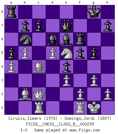 Last move : 1-0 2016 July 3 14:13:10 [Event "FICGS__CHESS__CLASS_B__000239"] [Site "FICGS"] [Date "2016.03.12"] [Round "1"] [White "Cirulis,Ilmars"] [Black "Domingo,Jordi"] [Result "1-0"] [WhiteElo "1973"] [BlackElo "1807"] 1.b4 e5 2.a3 d5 3.e3 a5 4.b5 Bd6 5.c4 Nf6 6.cxd5 Nxd5 7.d4 O-O 8.Bb2 Nd7 9.Nd2 Qe7 10.Ne4 N7f6 11.Nxf6+ Nxf6 12.Nf3 e4 13.Ne5 Be6 14.Qc2 Nd5 15.Be2 f5 16.O-O Rf6 17.g3 Nb6 18.a4 g5 19.Rac1 Nd5 20.Bc4 Nb6 21.d5 1-0 Polish (Sokolsky) opening Kingside Castling by player Black (move 7) Kingside Castling by player White (move 16) Player White won this chess game. Follow this game move after move (download)When you don't know what to do, wait for your opponent to get an idea - it's sure to be wrong. (Tarrasch) Wenn ich mich einlogge, glauben die Leute gewöhnlich nicht, dass ich es selbst bin und sie fangen an, mir dumme Fragen zu stellen. Und wenn sie es glauben, stellen sie wieder andere dumme Fragen. (Judith Polgar) El Ajedrez es de 30 a 40 por ciento psicología. Uno no cuenta con esto cuando se juega contra una computadora. No lo puedo confundir. (Judith Polgar) Shah mat. Le roi est mort. Cri de fierté d'un joueur venant de terrasser son adversaire, courtoisement, sans effusion de sang. A good book on your shelf is a friend that turns its back on you and remains a friend. (Author unknown)