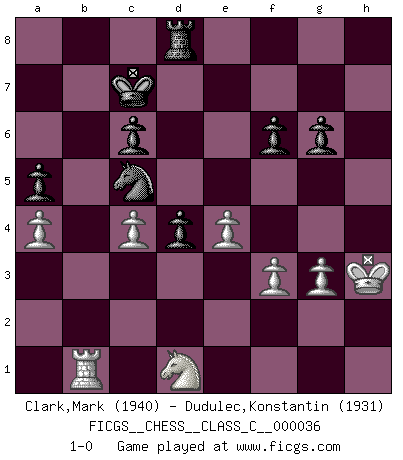 Last move : 1-0 2007 October 31 5:27:32 [Event "FICGS__CHESS__CLASS_C__000036"] [Site "FICGS"] [Date "2007.03.24"] [Round "1"] [White "Clark,Mark"] [Black "Dudulec,Konstantin"] [Result "1-0"] [WhiteElo "1940"] [BlackElo "1931"] 1.e4 e5 2.Nf3 Nc6 3.Bb5 a6 4.Bxc6 dxc6 5.O-O f6 6.d4 exd4 7.Nxd4 c5 8.Nb3 Qxd1 9.Rxd1 Bd7 10.Nc3 O-O-O 11.Bf4 g5 12.Be3 b6 13.Nd5 Be6 14.c4 Bd6 15.a4 a5 16.Rd2 Ne7 17.Nc1 Ng6 18.b3 c6 19.Nc3 Bf4 20.Bxf4 Nxf4 21.R1a2 Rd4 22.g3 Rhd8 23.Rxd4 cxd4 24.Nd1 Ng6 25.Kg2 g4 26.Nd3 Ne5 27.Nf4 Bf7 28.Rb2 Bg6 29.Nxg6 hxg6 30.h3 Nd3 31.Rd2 gxh3+ 32.Kxh3 Nc5 33.f3 Nxb3 34.Rb2 Nc5 35.Rxb6 Kc7 36.Rb1 1-0 Ruy Lopez : Exchange, Gligoric variation Kingside Castling by player White (move 5) Queenside Castling by player Black (move 10) Player White won this chess game. Follow this game move after move (download)The older I grow, the more I value pawns. (Paul Keres) Bobby Fischer ist kein Vorbild für die heutige Jugend. (Viktor Kortschnoi) Robert Fischer es la ley hacia si mismo. (Larry Evans) Un millionnaire : 'Monsieur Steinitz ! Vous ne participez aux tournois que pour l'argent, alors que moi je n'y viens que pour l'honneur.' Steinitz : 'Chacun joue pour ce qu'il n'a pas'... You must have a dream in order to have it come true. (A.P.J. Kalam)