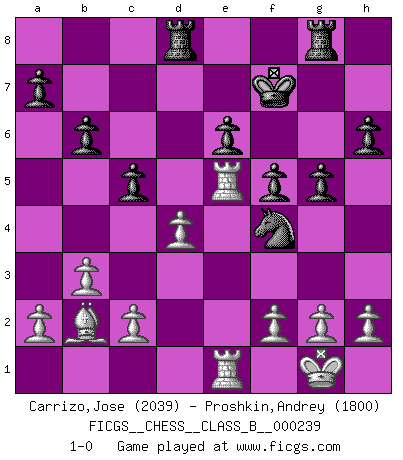 Last move : 1-0 2016 August 3 17:40:38 [Event "FICGS__CHESS__CLASS_B__000239"] [Site "FICGS"] [Date "2016.03.12"] [Round "1"] [White "Carrizo,Jose"] [Black "Proshkin,Andrey"] [Result "1-0"] [WhiteElo "2039"] [BlackElo "1800"] 1.e4 c6 2.d4 d5 3.Nc3 dxe4 4.Nxe4 Nd7 5.Ng5 Ngf6 6.Bd3 e6 7.N1f3 Bd6 8.Qe2 h6 9.Ne4 Nxe4 10.Qxe4 Qc7 11.O-O b6 12.Qg4 Kf8 13.b3 Bb7 14.Bb2 Nf6 15.Qh4 Nd5 16.Rfe1 Nf4 17.Ne5 g5 18.Qg4 Rg8 19.Rad1 Rd8 20.Qf3 c5 21.Be4 Bxe4 22.Qxe4 f5 23.Qe3 Bxe5 24.Qxe5 Qxe5 25.Rxe5 Kf7 26.Rde1 1-0 Caro-Kann : Steinitz variation Kingside Castling by player White (move 11) Player White won this chess game. Follow this game move after move (download)Of all my Russian books, the defense contains and diffuses the greatest 'warmth' which may seem odd seeing how supremely abstract Chess is supposed to be. (Vladimir Nabokov) Gewinnen beim Schach fördert das Selbstvertrauen. Beim Sex spüre ich sowas nicht... (Garry Kasparov) a manera como él juega al Ajedrez, demuestra la completa naturaleza de un hombre. (Stanley Ellin) Mais n'est-ce pas déjà le limiter injurieusement que d'appeler les échecs un jeu? N'est-ce pas aussi une science, un art, ou quelque chose qui, comme le cercueil de Mahomet entre ciel et terre, est suspendu entre l'un et l'autre, et qui réunit un nombre incroyable de contraires ? (Stefan Zweig) I don't diet. I just don't eat as much as I'd like to. (Linda Evangelista, supermodel)
