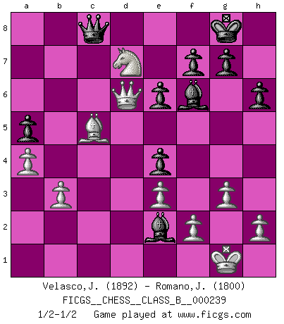 Last move : 1/2-1/2 2016 June 6 0:45:17 [Event "FICGS__CHESS__CLASS_B__000239"] [Site "FICGS"] [Date "2016.03.12"] [Round "1"] [White "Velasco,Jose Maria"] [Black "Romano,Jacopo"] [Result "1/2-1/2"] [WhiteElo "1892"] [BlackElo "1800"] 1.d4 Nf6 2.c4 e6 3.Nf3 b6 4.g3 Ba6 5.b3 b5 6.cxb5 Bxb5 7.Bg2 d5 8.O-O Nbd7 9.Nc3 Ba6 10.Ne5 c6 11.Nd3 Rc8 12.Bb2 Be7 13.Qd2 O-O 14.Rfc1 c5 15.Nxc5 Nxc5 16.dxc5 Rxc5 17.Na4 Rxc1+ 18.Rxc1 Bb5 19.e3 Qb8 20.Qa5 a6 21.Nb6 Bd8 22.Bd4 h6 23.a4 Bd3 24.Rc3 Be2 25.Rc6 Qb7 26.Qc5 Ne4 27.Bxe4 dxe4 28.Rc8 Be7 29.Qe5 Bf6 30.Rxf8+ Kxf8 31.Bc5+ Kg8 32.Qd6 a5 33.Nd7 Qc8 1/2-1/2 Queen's Indian : Nimzovich variation (exaggerated Fianchetto) Kingside Castling by player White (move 8) Kingside Castling by player Black (move 13) This chess game ended in a draw. Follow this game move after move (download)It is peculiar but a fact nevertheless, that gamblers in chess always have enthusiastic followers. (Botvinnik) Der Schachmeister von Heute braucht Courage, einen Killerinstinkt, Ausdauer und Arroganz. (Larry Evans) Muchos jugadores de Ajedrez se sorprendían cuando después de la partida, Fischer explicaba con calma: 'Yo ya había analizado esta posibilidad' en una posición en la cual yo creía que no era posible de prever desde la apertura. (Mikhail Tal) Il a essayé de se convaincre qu'il pourrait empêcher toutes les erreurs et ne jamais perdre. L'horreur ! Gary Kasparov au sujet de Robert Fischer. Every vice is only an exaggeration of a necessary and virtuous function. (Ralph Waldo Emerson, Journals 1936)