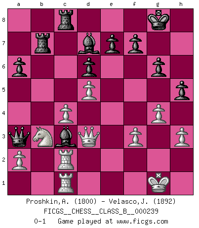 Last move : 0-1 2016 August 3 5:38:25 [Event "FICGS__CHESS__CLASS_B__000239"] [Site "FICGS"] [Date "2016.03.12"] [Round "1"] [White "Proshkin,Andrey"] [Black "Velasco,Jose Maria"] [Result "0-1"] [WhiteElo "1800"] [BlackElo "1892"] 1.e4 c5 2.Nf3 d6 3.d4 cxd4 4.Qxd4 Nc6 5.Bb5 Bd7 6.Bxc6 Bxc6 7.c4 Nf6 8.Nc3 g6 9.O-O Bg7 10.Qd3 O-O 11.Nd4 Qb6 12.Rd1 Ng4 13.Qd2 Qc5 14.h3 Nf6 15.Qe2 Rac8 16.b3 a6 17.Bf4 Bd7 18.Be3 Qa5 19.Rac1 b5 20.Nd5 Nxd5 21.exd5 bxc4 22.bxc4 Qb4 23.Rd2 Rc7 24.Rb2 Qa4 25.Qd3 Rfc8 26.Rbc2 Rb8 27.Bg5 Be8 28.Nb3 h6 29.Bf4 Bd7 30.g4 Rbc8 31.Be3 h5 32.f3 Qb4 33.Bd2 Qa3 34.Ba5 Rb7 35.Bc3 Bxc3 0-1 Sicilian, Chekhover variation Kingside Castling by player White (move 9) Kingside Castling by player Black (move 10) Player Black won this chess game. Follow this game move after move (download)Chess demands total concentration. (Bobby Fischer) Ich verachte die Medien. (Robert James Fischer) En manos de Fischer's, una diminuta ventaja teórica es tan buena como tener una Reina de ventaja. (Isaac Kashdan) Karpov est une pièce de musée. (Garry Kasparov) Those who make the worst use of their time are the first to complain of its brevity. (Jean de la Bruyere)