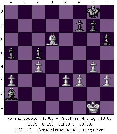 Last move : 1/2-1/2 2016 May 26 19:52:34 [Event "FICGS__CHESS__CLASS_B__000239"] [Site "FICGS"] [Date "2016.03.12"] [Round "1"] [White "Romano,Jacopo"] [Black "Proshkin,Andrey"] [Result "1/2-1/2"] [WhiteElo "1800"] [BlackElo "1800"] 1.d4 Nf6 2.c4 e5 3.dxe5 Ng4 4.Bf4 Nc6 5.Nf3 Bb4+ 6.Nbd2 Qe7 7.e3 Ngxe5 8.Nxe5 Nxe5 9.Be2 O-O 10.O-O d6 11.Nb3 b6 12.a3 Bc5 13.Nxc5 bxc5 14.b4 Nd7 15.Bg4 a5 16.Bxd7 Bxd7 17.bxc5 dxc5 18.Bxc7 Bc6 19.Bf4 Rfd8 20.Qc2 Be4 21.Qb2 h6 22.Rfd1 Rxd1+ 23.Rxd1 Rd8 24.Rxd8+ Qxd8 25.h3 Qd3 26.f3 Qb1+ 27.Qxb1 Bxb1 28.g4 Ba2 29.Bd6 1/2-1/2 Budapest : Rubinstein variation Kingside Castling by player Black (move 9) Kingside Castling by player White (move 10) This chess game ended in a draw. Follow this game move after move (download)Bobby Fischer is the greatest Chess player who has ever lived. (Ken Smith) Unter Putin wird alles Geld aus Russland wie von einem Staubsauger nach Moskau umgeleitet, das ist wie ein schwarzes Loch. (Garry Kasparov) El Peón aislado arroja penumbra sobre todo el tablero. (Aaron Nimzovich) Lorsque vous vous retrouvez devant une position atroce, ne tendez pas un ultime piège dérisoire avec l'intention d'abandonner si l'adversaire le déjoue ! Faites-vous plutôt un devoir de résister comme si votre vie en dépendait. Jouez le coup qui vous déplairait au centuple si vous étiez dans la peau de votre tortionnaire ! Go and wake up your luck. (Persian saying)