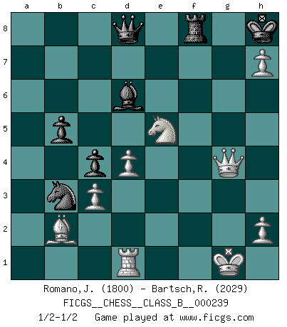 Last move : 1/2-1/2 2016 June 1 21:46:14 [Event "FICGS__CHESS__CLASS_B__000239"] [Site "FICGS"] [Date "2016.03.12"] [Round "1"] [White "Romano,Jacopo"] [Black "Bartsch,Reinhard Andrea"] [Result "1/2-1/2"] [WhiteElo "1800"] [BlackElo "2029"] 1.d4 Nf6 2.c4 e6 3.Nc3 d5 4.cxd5 Nxd5 5.e4 Nxc3 6.bxc3 c5 7.a3 Be7 8.Nf3 O-O 9.Bd3 Nc6 10.Bb2 Na5 11.O-O b6 12.Qe2 Bb7 13.Rad1 Rc8 14.Ne5 Qc7 15.Qh5 b5 16.Ng4 g6 17.Qh6 f5 18.Ne5 c4 19.Be2 Rf6 20.exf5 exf5 21.Qh3 Nb3 22.f4 a6 23.a4 Re8 24.Rf2 Qd8 25.axb5 axb5 26.Bf3 Bxf3 27.Qxf3 Re6 28.g4 fxg4 29.Qxg4 Rf6 30.f5 Bd6 31.fxg6 Rxf2 32.gxh7+ Kh8 33.Kxf2 Rf8+ 34.Kg1 1/2-1/2 Queen's pawn game Kingside Castling by player Black (move 8) Kingside Castling by player White (move 11) This chess game ended in a draw. Follow this game move after move (download)If a ruler does not understand Chess, how can he rule over a kingdom ? (King Khusros II) Ein Isolani verdüstert die Stimmung auf dem ganzen Schachbrett. (Savielly Grigorievitsch Tartakower) No hay un Gran Maestro de Ajedrez que sea normal; solo se diferencían ellos por la magnitud de su locura. (Viktor Korchnoi) Dans le domaine de la peinture, de la gravure et de la sculpture, dès la première décennie de notre siècle, les artistes abandonnent la représentation de la partie d'échecs pour se concentrer sur les pièces, sur les échiquiers et sur toutes les variations auxquelles les unes et les autres peuvent donner lieu. On passe en quelque sorte d'un thème social à un thème musical (au sens de la musica médiévale, c'est-à-dire d'une notion qui inclue le rythme, l'harmonie, la construction et la déconstruction, etc.). Graphiquement et picturalement, l'échiquier apparaît comme une structure ouverte, dynamique, d'une richesse infinie, autorisant toutes les combinatoires et débouchant sur des mouvements et des rythmes de nature exponentielle. (Michel Pastoureau) When it is a question of money, everybody is of the same religion. (Voltaire)
