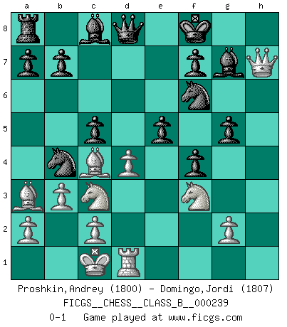 Last move : 0-1 2016 August 1 17:28:2 [Event "FICGS__CHESS__CLASS_B__000239"] [Site "FICGS"] [Date "2016.03.12"] [Round "1"] [White "Proshkin,Andrey"] [Black "Domingo,Jordi"] [Result "0-1"] [WhiteElo "1800"] [BlackElo "1807"] 1.e4 e5 2.f4 exf4 3.Nf3 d6 4.d4 g5 5.Bc4 Bg7 6.h4 h6 7.Qd3 Nc6 8.hxg5 hxg5 9.Rxh8 Bxh8 10.e5 Kf8 11.Nc3 dxe5 12.Qh7 Bg7 13.b3 Nb4 14.Ba3 c5 15.O-O-O Nf6 0-1 This chess game has been lost on time (started : 2016.03.12 20:19:18) KGA : Fischer defense Queenside Castling by player White (move 15) Player Black won this chess game. Follow this game move after move (download)No Chess Grandmaster is normal; they only differ in the extent of their madness. (Viktor Korchnoi) Ja, jede Frau in Holland liebt mich bestimmt, und alle Männer hassen mich. (Loek van Wely) Debió haber existido una vez en que los hombres eran semidióses, de otra manera no hubiesen podido inventar el Ajedrez. (Gustav Schenk) Les échecs sont plus proches de l'art de l'assassinat que de l'art de la guerre. (Arturo Perez-Reverte) Happy endings are just stories that haven't finished yet. (Jane Smith in Mr & Mrs Smith)