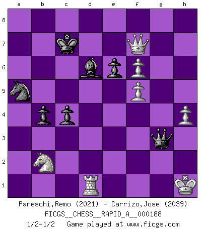 Last move : 1/2-1/2 2016 July 24 18:39:33 [Event "FICGS__CHESS__RAPID_A__000188"] [Site "FICGS"] [Date "2016.03.12"] [Round "1"] [White "Pareschi,Remo"] [Black "Carrizo,Jose"] [Result "1/2-1/2"] [WhiteElo "2021"] [BlackElo "2039"] 1.d4 d5 2.c4 e6 3.Nc3 c6 4.Nf3 Nf6 5.Bg5 dxc4 6.e4 b5 7.e5 h6 8.Bh4 g5 9.Nxg5 hxg5 10.Bxg5 Nbd7 11.g3 Bb7 12.Bg2 Qb6 13.exf6 O-O-O 14.O-O c5 15.d5 b4 16.Na4 Qb5 17.a3 Nb8 18.axb4 cxb4 19.Be3 Bxd5 20.Bxd5 Rxd5 21.Qe2 Nc6 22.Rfc1 Ne5 23.h4 Bd6 24.Bxa7 Kb7 25.Be3 Rd3 26.b3 Rxb3 27.Rd1 Rd3 28.f4 Nc6 29.Bf2 Ra8 30.Nb2 Rxa1 31.Rxa1 Rc3 32.Rd1 Kc7 33.Be1 Na5 34.Kh2 Ra3 35.f5 Qc5 36.Qh5 Rxg3 37.Bxg3 Qf2+ 38.Kh1 Qxg3 39.Qxf7+ 1/2-1/2 QGD : Semi-Slav Queenside Castling by player Black (move 13) Kingside Castling by player White (move 14) This chess game ended in a draw. Follow this game move after move (download)You are for me the Queen on d8 and I am the Pawn on d7 !! (Eduard Gufeld) Es ist besser die Steine des Gegners zu opfern. (Savielly Grigorievitsch Tartakower) Aún el Rey más flojo huye despavorido ante la amenaza de un Jaque doble. (Aaron Nimzowitsch) Fischer est le meilleur joueur du monde et Karpov n'est qu'un joueur de bistrot. (Garry Kasparov, agé de 16 ans) Train yourself to let go of everything you fear to lose. (Master Yoda in Star Wars ep.3)