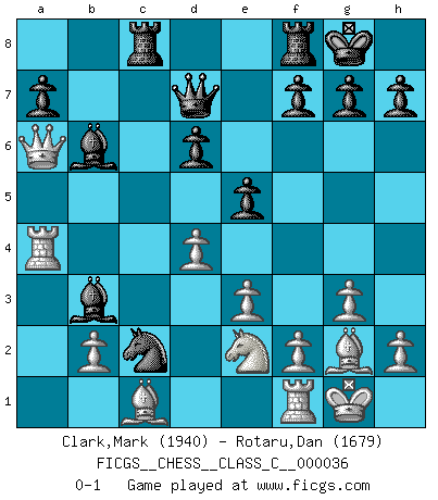 Last move : 0-1 2007 April 25 5:37:50 [Event "FICGS__CHESS__CLASS_C__000036"] [Site "FICGS"] [Date "2007.03.24"] [Round "1"] [White "Clark,Mark"] [Black "Rotaru,Dan"] [Result "0-1"] [WhiteElo "1940"] [BlackElo "1679"] 1.c4 Nf6 2.Nc3 e5 3.g3 Bb4 4.Nd5 Nxd5 5.cxd5 O-O 6.Bg2 c6 7.Qb3 Bc5 8.e3 cxd5 9.Bxd5 Nc6 10.Ne2 d6 11.O-O Nb4 12.Bg2 Be6 13.Qd1 Nxa2 14.Bxb7 Rb8 15.Bg2 Bb3 16.Qe1 Nb4 17.d4 Nc2 18.Qa5 Bb6 19.Qa6 Rc8 20.Ra4 Qd7 0-1 English Opening Kingside Castling by player Black (move 5) Kingside Castling by player White (move 11) Player Black won this chess game. Follow this game move after move (download)It is not a move, even the best move that you must seek, but a realizable plan. (Eugene Znosko-Borovsky) Obwohl ich vom Stil her kaum zu den Priestern der Schachkunst gezählt werde, halte ich Schach doch für eine Kunst. (Tigran Petrosjan) Aquellos que dicen que entienden al Ajedrez, no entienden nada. (Robert Hubner) J'ai vu le vaincu d'Echecs jouer des années durant dans l'espoir de la fête de la victoire. Car tu es plus riche de ce qu'elle existe si même elle n'est point pour toi. Ainsi de la perle du fond des mers. (Antoine de Saint-Exupéry) Mandala - that's it! 16x16 squares as multiple of the four and the eight because of the Four Noble Truths and the Noble Eightfold Path. (Heinz-Georg Lehnhoff about Big Chess)