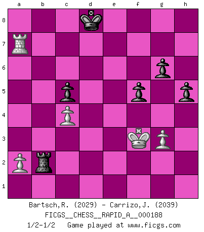 Last move : 1/2-1/2 2016 June 5 14:54:18 [Event "FICGS__CHESS__RAPID_A__000188"] [Site "FICGS"] [Date "2016.03.12"] [Round "1"] [White "Bartsch,Reinhard Andrea"] [Black "Carrizo,Jose"] [Result "1/2-1/2"] [WhiteElo "2029"] [BlackElo "2039"] 1.c4 e6 2.d4 d5 3.Nc3 c6 4.e4 dxe4 5.Nxe4 Bb4+ 6.Bd2 Qxd4 7.Bxb4 Qxe4+ 8.Qe2 Nf6 9.Rd1 b6 10.Qxe4 Nxe4 11.Bd3 Nf6 12.Bd6 Bb7 13.Nf3 c5 14.Ne5 Nfd7 15.f4 Nc6 16.Nxd7 Kxd7 17.Be4 Ke8 18.f5 exf5 19.Bxf5 g6 20.Bh3 f5 21.O-O h5 22.g3 Rd8 23.Bg2 Nd4 24.Bxc5 Ne2+ 25.Kh1 Nxg3+ 26.hxg3 Bxg2+ 27.Kxg2 bxc5 28.Rxd8+ Kxd8 29.Rf3 Re8 30.Ra3 Re2+ 31.Kf3 Rxb2 32.Rxa7 1/2-1/2 English Opening Kingside Castling by player White (move 21) This chess game ended in a draw. Follow this game move after move (download)I look one move ahead... the best ! (Siegbert Tarrasch) Ich möchte Schüler heranbilden, die das Vermögen haben, selbst zu denken und Kritik zu üben. (Emanuel Lasker) Muchos jugadores de Ajedrez se sorprendían cuando después de la partida, Fischer explicaba con calma: 'Yo ya había analizado esta posibilidad' en una posición en la cual yo creía que no era posible de prever desde la apertura. (Mikhail Tal) Aidez vos pièces, elles vous aideront. (Paul Morphy) You must have a dream in order to have it come true. (A.P.J. Kalam)