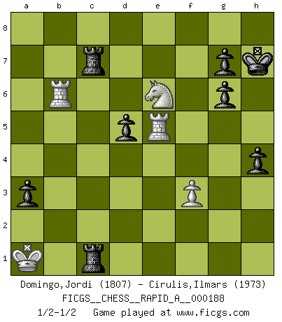 Last move : 1/2-1/2 2016 June 28 22:37:50 [Event "FICGS__CHESS__RAPID_A__000188"] [Site "FICGS"] [Date "2016.03.12"] [Round "1"] [White "Domingo,Jordi"] [Black "Cirulis,Ilmars"] [Result "1/2-1/2"] [WhiteElo "1807"] [BlackElo "1973"] 1.e4 a6 2.d4 e6 3.Nf3 d5 4.Nc3 Nf6 5.Bd3 c5 6.exd5 exd5 7.Qe2+ Be7 8.dxc5 O-O 9.Be3 Nbd7 10.O-O-O Bxc5 11.Rhe1 b5 12.Bf5 Bxe3+ 13.Qxe3 Nb6 14.Bd3 Bg4 15.Qf4 Rc8 16.Ne2 Nc4 17.Nfd4 Qa5 18.Kb1 Bh5 19.g4 Bg6 20.Nb3 Qb4 21.Qd4 Rfe8 22.h4 a5 23.Bxg6 hxg6 24.g5 Ne4 25.f3 a4 26.a3 Nxa3+ 27.bxa3 Qxa3 28.Nd2 Nxd2+ 29.Qxd2 Re3 30.Nd4 Rec3 31.Qc1 Qb4+ 32.Qb2 Qf8 33.h5 a3 34.Qc1 Qb4+ 35.Ka1 R3c4 36.c3 Rxc3 37.Qb1 Qxb1+ 38.Rxb1 gxh5 39.Rxb5 Kh7 40.Re5 R3c5 41.Rb7 R8c7 42.Rb6 h4 43.g6+ fxg6 44.Ne6 Rc1+ 1/2-1/2 St. George (Baker) defense Kingside Castling by player Black (move 8) Queenside Castling by player White (move 10) This chess game ended in a draw. Follow this game move after move (download)The older I grow, the more I value Pawns. (Keres) Ich verstehe mehr vom Schach als irgendein anderer lebender Meister. (José Raúl Capablanca) El jugador de combinación piensa hacia adelante; comienza de la posición dada y trabaja las movidas contundentes en su mente. (Emanuel Lasker) Le jeu d'échecs est comme rejeté hors du temps. (Antoine de Saint-Exupéry) Strategy without tactics is the slowest route to victory. Tactics without strategy is the noise before defeat. (Sun Tzu)