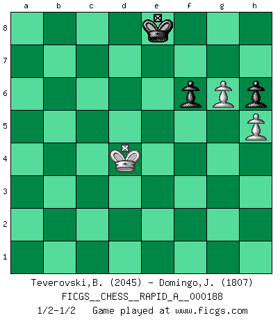 Last move : 1/2-1/2 2016 November 23 19:22:51 [Event "FICGS__CHESS__RAPID_A__000188"] [Site "FICGS"] [Date "2016.03.12"] [Round "1"] [White "Teverovski,Bogoljub"] [Black "Domingo,Jordi"] [Result "1/2-1/2"] [WhiteElo "2045"] [BlackElo "1807"] 1.e4 e5 2.Nf3 d6 3.Bc4 Be7 4.d4 exd4 5.Nxd4 Nf6 6.Nc3 O-O 7.O-O c6 8.Re1 b5 9.Bf1 b4 10.Na4 c5 11.Nf5 Bxf5 12.exf5 Nc6 13.a3 a5 14.g3 d5 15.Bg2 c4 16.Bf4 Re8 17.axb4 axb4 18.b3 Na5 19.Re2 Ra7 20.Nb2 Rd7 21.Re1 Bc5 22.Rxe8+ Nxe8 23.Bf3 Nf6 24.Kg2 h6 25.Ra4 cxb3 26.cxb3 Bf8 27.Ra1 Bd6 28.Bxd6 Rxd6 29.Nd3 Nc6 30.Ra4 Qb8 31.Qe1 Rd8 32.Nxb4 Ne5 33.Qe2 Kh7 34.h3 Kg8 35.Qd1 Qb7 36.g4 Nxf3 37.Qxf3 Kh7 38.h4 Re8 39.Nc2 Qc7 40.Ne3 Qc3 41.g5 Qxb3 42.Ra7 d4 43.Rb7 Qa2 44.Nd1 Ne4 45.Rxf7 Kg8 46.g6 Qd5 47.Nb2 Rf8 48.Re7 Nc3 49.Qxd5+ Nxd5 50.Re5 Nb4 51.Rb5 Nc6 52.Kg3 d3 53.Nxd3 Nd4 54.Re5 Rxf5 55.Rxf5 Nxf5+ 56.Kg4 Ne7 57.h5 Kf8 58.Nb4 Nc8 59.f4 Nb6 60.f5 Ke7 61.Kf4 Nd7 62.Nd5+ Kf8 63.Ke4 Ke8 64.f6 Nxf6+ 65.Nxf6+ gxf6 66.Kd4 1/2-1/2 Philidor's defense Kingside Castling by player Black (move 6) Kingside Castling by player White (move 7) 10 pieces endgame at move 55 : White KRNPPP , Black KNPP WHITE : King + 1 Rook 1 Knight 3 Pawns BLACK : King + 1 Knight 2 Pawns 9 pieces endgame at move 55 : White KNPPP , Black KNPP WHITE : King + 1 Knight 3 Pawns BLACK : King + 1 Knight 2 Pawns 8 pieces endgame at move 64 : White KNPP , Black KNPP WHITE : King + 1 Knight 2 Pawns BLACK : King + 1 Knight 2 Pawns 7 pieces endgame at move 65 : White KNPP , Black KPP WHITE : King + 1 Knight 2 Pawns BLACK : King + 2 Pawns 6 pieces endgame at move 65 : White KPP , Black KPP WHITE : King + 2 Pawns BLACK : King + 2 Pawns This chess game ended in a draw. Follow this game move after move (download)Chess is a fairy tale of 1001 blunders. (Savielly Tartakower) Wenn ich gewinne bin ich ein Genie. Wenn nicht, dann bin ich keines. (Robert James Fischer) El Ajedrez no es como la vida... ¡tiene reglas!. (Mark Pasternak) La conception d'un plan est le processus par lequel un joueur exploite les avantages de sa position tout en s'efforçant d'en réduire au minimum les inconvénients. Afin de garantir le succès, un plan doit toujours se fonder sur un diagnostic objectif des particularités d'une position. La conception d'un plan est d'autant plus difficile que la position est équilibrée, et grandement facilitée lorsqu'il n'existe qu'un seul plan susceptible de répondre aux exigences de la position. (Harry Golombek) Hardware: the parts of a computer that can be kicked. (Jeff Persis)