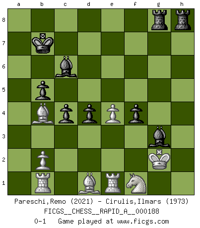 Last move : 0-1 2016 September 8 9:9:34 [Event "FICGS__CHESS__RAPID_A__000188"] [Site "FICGS"] [Date "2016.03.12"] [Round "1"] [White "Pareschi,Remo"] [Black "Cirulis,Ilmars"] [Result "0-1"] [WhiteElo "2021"] [BlackElo "1973"] 1.d4 a6 2.e4 e6 3.Nf3 d5 4.e5 c5 5.c3 Ne7 6.Bd3 Nbc6 7.Bg5 Qb6 8.Qd2 c4 9.Be2 h6 10.Bf4 g5 11.Be3 Nf5 12.O-O g4 13.Ne1 h5 14.Bf4 Bd7 15.Na3 Nfxd4 16.cxd4 Qxd4 17.Qxd4 Nxd4 18.Bd1 b5 19.Nac2 Nc6 20.h3 Bg7 21.hxg4 hxg4 22.Bxg4 Nxe5 23.Bd1 Nc6 24.Rb1 e5 25.Bd2 f5 26.Ne3 d4 27.Nd5 O-O-O 28.g3 Be8 29.Nb4 Kb7 30.Nf3 Bf6 31.a4 Nxb4 32.Bxb4 Bc6 33.Re1 f4 34.Kg2 e4 35.Nd2 Rde8 36.f3 Reg8 37.Nf1 Bh4 38.axb5 axb5 39.fxe4 Bxg3 0-1 Queen's pawn Kingside Castling by player White (move 12) Queenside Castling by player Black (move 27) Player Black won this chess game. Follow this game move after move (download)If cunning alone were needed to excel, women would be the best Chess players. (Albin) Ich hatte Angst gegen einen russischen Großmeister zu verlieren, und er befürchtete gegen einen kleinen Jungen zu verlieren. (über ein Remis gegen Juri Awerbach). (Robert James Fischer) Solo existe una cosa que Fischer hace en el Ajedrez sin placer: ¡perder!. (Boris Spassky) Il n'y a pas de prix trop élevé au scalp de l'ennemi. (Koblentz) Ah, the Socrating method. The best way we have of teaching everything-apart from juggling chainsaws. (Gregory House, House M.D.)