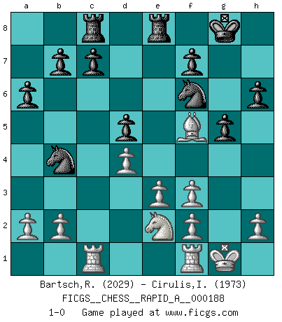 Last move : 1-0 2016 June 10 12:18:50 [Event "FICGS__CHESS__RAPID_A__000188"] [Site "FICGS"] [Date "2016.03.12"] [Round "1"] [White "Bartsch,Reinhard Andrea"] [Black "Cirulis,Ilmars"] [Result "1-0"] [WhiteElo "2029"] [BlackElo "1973"] 1.c4 e6 2.d4 a6 3.Nf3 d5 4.cxd5 exd5 5.Nc3 Nc6 6.Bf4 Nf6 7.e3 Bd6 8.Bg5 Be6 9.Bd3 h6 10.Bh4 O-O 11.O-O Re8 12.Rc1 g5 13.Bg3 Bg4 14.Bxd6 Qxd6 15.Ne2 Bxf3 16.gxf3 Rac8 17.Qb3 Qb4 18.Qxb4 Nxb4 19.Bf5 1-0 English Opening Kingside Castling by player Black (move 10) Kingside Castling by player White (move 11) Player White won this chess game. Follow this game move after move (download)Only the player with the initiative has the right to attack. (Wilhelm Steinitz) Der Bart als Geschlechtszeichen mitten im Gesicht ist obszön. Daher gefällt er den Weibern. [Zugegeben, kein Schachzitat, aber unglaublich originell] (Arthur Schopenhauer) El Ajedrez es la vida. (Bobby Fischer) Même un GMI sait rarement calculer sur plus de cinq coups une attaque à sacrifices. (Rudolf Spielmann) Luck is when opportunity knocks and you answer. (Anonymous)