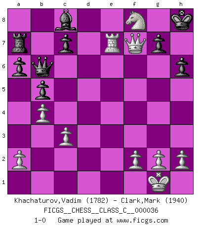 Last move : 1-0 2007 June 20 17:52:15 [Event "FICGS__CHESS__CLASS_C__000036"] [Site "FICGS"] [Date "2007.03.24"] [Round "1"] [White "Khachaturov,Vadim"] [Black "Clark,Mark"] [Result "1-0"] [WhiteElo "1782"] [BlackElo "1940"] 1.e4 Nc6 2.d4 e5 3.dxe5 Nxe5 4.Nf3 Qf6 5.Nxe5 Qxe5 6.Bd3 Bc5 7.O-O Nf6 8.Nd2 d6 9.Nc4 Qe7 10.c3 a6 11.b4 Ba7 12.e5 dxe5 13.Nxe5 O-O 14.Re1 Qd6 15.Qc2 h6 16.Bf4 Qb6 17.Be3 Qd6 18.Bxa7 Rxa7 19.Rad1 b5 20.Bg6 Qb6 21.Bxf7+ Rxf7 22.Rd8+ Rf8 23.Rxf8+ Kxf8 24.Ng6+ Kf7 25.Re7+ Kg8 26.Qb3+ Nd5 27.Qxd5+ Kh7 28.Nf8+ Kh8 29.Qf7 1-0 KP : Nimzovich defense Kingside Castling by player White (move 7) Kingside Castling by player Black (move 13) Player White won this chess game. Follow this game move after move (download)All I want to do, ever, is just play Chess. (Bobby Fischer) Es macht mich traurig, wenn ich sehe, dass Golfprofis mehr verdienen als Schachsportler. Obwohl ich davon überzeugt bin, dass wir Schachspieler viel härter trainieren müssen als die Golfer. (Alexandra Kosteniuk) El sobresalir en el Ajedrez es un signo de una mente intrigante. (Sir Arthur Conan Doyle) On a dit que l'homme se distingue de l'animal par le fait qu'il achète plus de livres qu'il ne peut en lire. Je voudrais suggérer qu'inclure à la liste des livres quelques livres d'échecs rendrait la distinction manifeste. (Edward Lasker) If passion drives you, let reason holds the reins. (Benjamin Franklin)