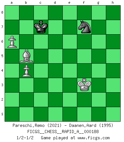 Last move : 1/2-1/2 2016 April 12 23:24:52 [Event "FICGS__CHESS__RAPID_A__000188"] [Site "FICGS"] [Date "2016.03.12"] [Round "1"] [White "Pareschi,Remo"] [Black "Daanen,Aard"] [Result "1/2-1/2"] [WhiteElo "2021"] [BlackElo "1995"] 1.d4 Nf6 2.c4 g6 3.Nc3 d5 4.f3 c5 5.dxc5 d4 6.Nb5 Nc6 7.e3 e5 8.exd4 Nxd4 9.Ne2 Bxc5 10.Nexd4 exd4 11.Qe2+ Be6 12.Qe5 Bb4+ 13.Bd2 Bxd2+ 14.Kxd2 O-O 15.Nc7 Rc8 16.Nxe6 fxe6 17.Rd1 Qb6 18.Kc1 Rcd8 19.h4 Qd6 20.Re1 Kg7 21.Bd3 Qxe5 22.Rxe5 Nh5 23.Kd2 Nf4 24.Be4 Kf6 25.Rb5 b6 26.g3 Nh5 27.Rg1 e5 28.c5 bxc5 29.g4 Nf4 30.Rxc5 Rd6 31.Rgc1 Ng2 32.Rc6 Ke6 33.h5 Nh4 34.Kd3 Rfd8 35.R6c5 gxh5 36.f4 exf4 37.Rxh5 Ng6 38.Kd2 Nf8 39.Bf5+ Kf6 40.Rc7 a6 41.Bd3 R8d7 42.Rxd7 Nxd7 43.g5 Ke6 44.Rxh7 Ne5 45.Rh6+ Ke7 46.Rxd6 Kxd6 47.Bxa6 Nf3+ 48.Kd3 Nxg5 49.Kxd4 Ne6+ 50.Kc3 f3 51.Kd2 Nd8 52.Ke3 Nc6 53.a3 Ne5 54.Bf1 Kc6 55.b4 Kd6 56.Bb5 Ke6 57.a4 Ke7 58.a5 Kd6 59.a6 Kc7 60.Kf4 Nf7 61.Kxf3 1/2-1/2 King's Indian defense, 3.Nc3 Kingside Castling by player Black (move 14) 10 pieces endgame at move 46 : White KBPPP , Black KNPPP WHITE : King + 1 Bishop 3 Pawns BLACK : King + 1 Knight 3 Pawns 9 pieces endgame at move 47 : White KBPPP , Black KNPP WHITE : King + 1 Bishop 3 Pawns BLACK : King + 1 Knight 2 Pawns 8 pieces endgame at move 48 : White KBPP , Black KNPP WHITE : King + 1 Bishop 2 Pawns BLACK : King + 1 Knight 2 Pawns 7 pieces endgame at move 49 : White KBPP , Black KNP WHITE : King + 1 Bishop 2 Pawns BLACK : King + 1 Knight 1 Pawn 6 pieces endgame at move 61 : White KBPP , Black KN WHITE : King + 1 Bishop 2 Pawns BLACK : King + 1 Knight This chess game ended in a draw. Follow this game move after move (download)Examine moves that smite! A good eye for smites is far more important than a knowledge of strategical principles. (Purdy) Nach Morphy wurde nichts neues mehr in der Behandlung offener Positionen gefunden. (Mikhail Moiseyevich Botvinik) El Ajedrez es un expediente tonto que hace creer a la gente inactiva que hacen una cosa muy astuta cuando solamente estan perdiendo su tiempo. (George Bernard Shaw) A chaque perte on perd un peu de soi. (Joël Lautier) Computers are like Old Testament gods; lots of rules and no mercy. (Joseph Campbell)