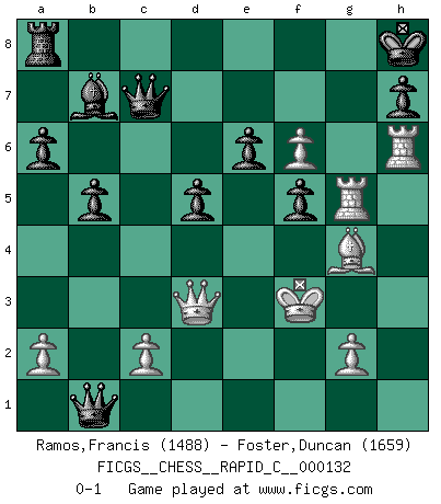 Last move : 0-1 2016 June 23 16:5:21 [Event "FICGS__CHESS__RAPID_C__000132"] [Site "FICGS"] [Date "2016.03.15"] [Round "1"] [White "Ramos,Francis"] [Black "Foster,Duncan"] [Result "0-1"] [WhiteElo "1488"] [BlackElo "1659"] 1.e4 b6 2.d4 Bb7 3.f3 e6 4.Be3 g6 5.Bd3 Bg7 6.Nc3 a6 7.Nge2 Ne7 8.O-O O-O 9.Qd2 d6 10.Rad1 Nd7 11.f4 f5 12.Ng3 Nf6 13.e5 Ng4 14.Be2 Nxe3 15.Qxe3 d5 16.h4 b5 17.h5 Rf7 18.Kf2 g5 19.Rh1 g4 20.h6 Bf8 21.Rh5 c5 22.Rg5+ Ng6 23.Rh1 Qb6 24.Nh5 cxd4 25.Qd3 dxc3 26.Kg3 cxb2 27.Nf6+ Kh8 28.Bxg4 Rxf6 29.exf6 Nxf4 30.Kxf4 Bxh6 31.Rxh6 Qc7+ 32.Kf3 b1Q 0-1 Owen defense Kingside Castling by player White (move 8) Kingside Castling by player Black (move 8) Promotion Queen by player Black (move 32) Player Black won this chess game. Follow this game move after move (download)Only sissies Castle. (Rob Sillars) Wenn Du absolut nicht mehr weißt, was Du tun sollst, dann ist es Zeit für Panik. (John van der Wiel) El Ajedrez no es como la vida... ¡tiene reglas!. (Mark Pasternak) Si le désir cupide (et stupide) de gagner est une inépuisable source de souffrance, une combinaison brillante sur l'échiquier est une découverte : le coquelicot qui s'épanouit lorsque apparaît la Voie Lactée. (Arrabal) True nature is revealed in times of difficulty. (Chinese proverb)