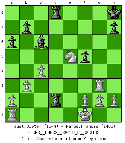 Last move : 1-0 2016 June 13 0:55:59 [Event "FICGS__CHESS__RAPID_C__000132"] [Site "FICGS"] [Date "2016.03.15"] [Round "1"] [White "Faust,Dieter"] [Black "Ramos,Francis"] [Result "1-0"] [WhiteElo "1644"] [BlackElo "1488"] 1.e4 c5 2.Nf3 d6 3.Bb5+ Nd7 4.d4 cxd4 5.Qxd4 Ngf6 6.O-O a6 7.Bxd7+ Bxd7 8.Bg5 e6 9.Nc3 Be7 10.e5 dxe5 11.Nxe5 O-O 12.Rfd1 Be8 13.Qh4 Qa5 14.Ng4 Qf5 15.Bxf6 Bxf6 16.Nxf6+ Qxf6 17.Qxf6 gxf6 18.Ne4 Kg7 19.Rd3 Bc6 20.Rg3+ Kh8 21.Nxf6 Rad8 22.c4 Rd2 23.b3 Rfd8 24.Kf1 e5 25.Ng4 f5 26.Nxe5 1-0 Sicilian : Canal-Sokolsky (Nimzovich-Rossolimo, Moscow) attack Kingside Castling by player White (move 6) Kingside Castling by player Black (move 11) Player White won this chess game. Follow this game move after move (download)What is the difference between chess and football? Everybody understands football, but nobody plays it. Everybody plays chess, but nobody understands it. Everything is relative. (Vladimir Kramnik) Wenn Capablanka heute auf der Schachbühne erscheinen würde, hätte er ein halbes Jahr gebraucht um sich die Schachtheorie anzueignen. Und dann hätte er alles und jeden besiegt. (Mikhail Moiseyevich Botvinik) Hay dos clases de hombres: aquellos que se conforman en dejarse llevar por las circunstancias y que juegan barajas y aquellos decididos a controlar las circunstancias y que juegan al Ajedrez. (Mortimer Collins) On est toujours la mazette de quelqu'un d'autre. (Anonyme) Convictions are more dangerous enemies of truth than lies. (Friedrich Nietzsche)