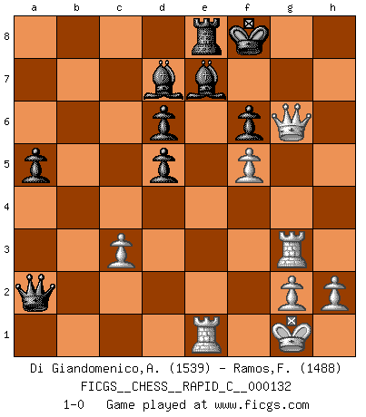 Last move : 1-0 2016 July 5 17:32:29 [Event "FICGS__CHESS__RAPID_C__000132"] [Site "FICGS"] [Date "2016.03.15"] [Round "1"] [White "Di Giandomenico,Alfonso"] [Black "Ramos,Francis"] [Result "1-0"] [WhiteElo "1539"] [BlackElo "1488"] 1.e4 c5 2.Nf3 d6 3.d4 cxd4 4.Nxd4 Nf6 5.Nc3 a6 6.Be2 e6 7.Be3 Be7 8.O-O O-O 9.f4 Qc7 10.Qe1 Nc6 11.Qg3 b5 12.Nxc6 Qxc6 13.Bf3 Bb7 14.e5 Nd5 15.Nxd5 exd5 16.c3 Qc4 17.Bd4 f6 18.e6 b4 19.f5 a5 20.Bh5 Ba6 21.Bf7+ Rxf7 22.exf7+ Kxf7 23.Qe3 Re8 24.Rfe1 Bb5 25.Qh3 h6 26.Re3 bxc3 27.bxc3 Bd7 28.Rae1 Qxa2 29.Qh5+ Kf8 30.Bxf6 gxf6 31.Qxh6+ Kf7 32.Qg6+ Kf8 33.Rg3 1-0 Sicilian : Najdorf, Opovcensky variation Kingside Castling by player White (move 8) Kingside Castling by player Black (move 8) Player White won this chess game. Follow this game move after move (download)A strong memory, concentration, imagination, and a strong will is required to become a great Chess player. (Bobby Fischer) Kostenjuk hat keinen Sexappeal. (Loek van Wely) El Ajedrez es el gimnasio de la mente. (Blaise Pascal) Le thème de l'attaque double intervient d'une manière ou d'une autre dans l'immense majorité des combinaisons. (Youri Averbakh) There are 10 types of people in this world: those who understand binary and those who don't. (Anonymous)