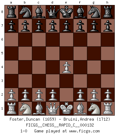 Last move : 1-0 2016 April 14 21:34:39 [Event "FICGS__CHESS__RAPID_C__000132"] [Site "FICGS"] [Date "2016.03.15"] [Round "1"] [White "Foster,Duncan"] [Black "Bruini,Andrea"] [Result "1-0"] [WhiteElo "1659"] [BlackElo "1712"] 1.e4 1-0 This chess game has been lost on time (started : 2016.03.15 15:23:24) King's pawn Opening Player White won this chess game. Follow this game move after move (download)In blitz, the Knight is stronger than the Bishop. (Vlastimil Hort) Korrekt heißt in Deutschland die Haltung eines Mannes, dessen Benehmen nach dem Urteile seiner Nachbarn seiner Stellung angemessen ist. Um korrekt zu sein, muß man sich der Meinung der anderen anpassen... (Emanuel Lasker) Un Peón pasado es un criminal, quién debe ser mantenido bajo candado y llave. Leves medidas, tales como vigilancia policiaca, no son suficientes. (Aaron Nimzovich) Il s'avisa de me proposer d'apprendre les échecs qu'il jouait un peu... me voilà forcené des échecs. J'achète un échiquier, je m'enferme dans ma chambre, j'y passe des jours et des nuits à vouloir apprendre par cur toutes les parties. (Jean-Jacques Rousseau, Confessions) SEO proverb : Make your website optimized for human beings, not for search engines.
