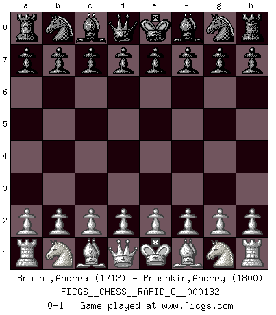 Last move : 0-1 2016 April 14 21:34:39 [Event "FICGS__CHESS__RAPID_C__000132"] [Site "FICGS"] [Date "2016.03.15"] [Round "1"] [White "Bruini,Andrea"] [Black "Proshkin,Andrey"] [Result "0-1"] [WhiteElo "1712"] [BlackElo "1800"] 0-1 This chess game has been lost on time (started : 2016.03.15 15:23:24) Player Black won this chess game. Follow this game move after move (download)Bobby Fischer is the greatest Chess genius of all time ! (Alexander Kotov) Charakterschwächen offenbaren sich normalerweise während einer Schachpartie. (Garry Kasparov) No hay precio que sea tan grande por la cabellera del Rey enemigo. (Koblentz) Ce qui caractérise les parties de combat, c'est que si le défenseur a constamment de difficiles problèmes à résoudre, l'attaquant doit chercher sans relâche de nouvelles possibilités d'attaque. (Koblentz) Gambling : The sure way of getting nothing from something. (Wilson Mizner)