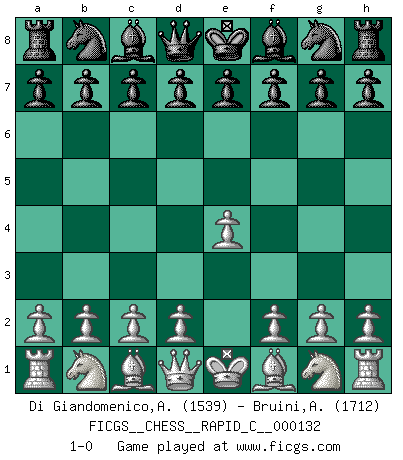 Last move : 1-0 2016 April 14 21:34:39 [Event "FICGS__CHESS__RAPID_C__000132"] [Site "FICGS"] [Date "2016.03.15"] [Round "1"] [White "Di Giandomenico,Alfonso"] [Black "Bruini,Andrea"] [Result "1-0"] [WhiteElo "1539"] [BlackElo "1712"] 1.e4 1-0 This chess game has been lost on time (started : 2016.03.15 15:23:24) King's pawn Opening Player White won this chess game. Follow this game move after move (download)We don't really know how the game was invented, though there are suspicions. As soon as we discover the culprits, we'll let you know. (Bruce Pandolfini) Bobby Fischer ist kein Vorbild für die heutige Jugend. (Viktor Kortschnoi) Fischer no está bajo la obligación de nadie. (Joseph Platz) Même si l'adversaire joue le coup analysé précédemment, recommencez l'analyse en voyant la nouvelle position. Première règle de Blumenfeld Sometimes it pays to stay in bed in Monday, rather than spending the rest of the week debugging Monday's code. (Dan Salomon)