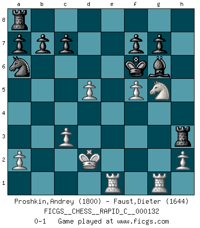 Last move : 0-1 2016 June 28 12:4:45 [Event "FICGS__CHESS__RAPID_C__000132"] [Site "FICGS"] [Date "2016.03.15"] [Round "1"] [White "Proshkin,Andrey"] [Black "Faust,Dieter"] [Result "0-1"] [WhiteElo "1800"] [BlackElo "1644"] 1.e4 e5 2.f4 d5 3.exd5 e4 4.d3 Nf6 5.dxe4 Nxe4 6.Nf3 Bc5 7.Qe2 Bf5 8.Nc3 Qe7 9.Be3 Bxe3 10.Qxe3 Nxc3 11.Qxe7+ Kxe7 12.bxc3 Be4 13.Ng5 Bxc2 14.Kd2 Bg6 15.Re1+ Kf6 16.g4 h5 17.gxh5 Bxh5 18.Rg1 Bg6 19.Bh3 Na6 20.f5 Rxh3 0-1 This chess game has been lost on time (started : 2016.03.15 15:23:24) KGD : Falkbeer, Main line, 7...Bf5 Player Black won this chess game. Follow this game move after move (download)There are two types of sacrifices: correct ones and mine. (Mikhail Tal) Wenn Du einsam bist, wenn Du Dich in der Welt wie ein Fremder fühlst, spiele Schach. Das wird Deinen Geist erheben und Dein Ratgeber im Kampf sein. (Aristoteles) La enorme capacidad mental, en la que sin ella no puede un jugador de Ajedrez existir, es demasiado requerida por el Ajedrez al grado de que nunca podrá liberar su mente de este juego. (Albert Einstein) On croit qu'il y a plus de mauvais joueurs que de bons joueurs, c'est faux : Il y a autant de joueurs qui gagnent que de joueurs qui perdent. (Philippe Geluck) The right perception of any matter and a misunderstanding of the same matter do not wholly exclude each other. (Kafka's the trial)