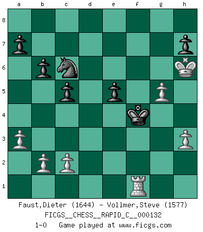 Last move : 1-0 2016 June 26 11:33:1 [Event "FICGS__CHESS__RAPID_C__000132"] [Site "FICGS"] [Date "2016.03.15"] [Round "1"] [White "Faust,Dieter"] [Black "Vollmer,Steve"] [Result "1-0"] [WhiteElo "1644"] [BlackElo "1577"] 1.e4 d6 2.Nc3 Nf6 3.f4 g6 4.d4 Bg7 5.Nf3 O-O 6.a3 c5 7.dxc5 dxc5 8.Qxd8 Rxd8 9.e5 Nd5 10.Nxd5 Rxd5 11.Bd3 Nc6 12.Be3 Bg4 13.Be4 Rad8 14.Bxd5 Rxd5 15.Rd1 Rxd1+ 16.Kxd1 Bh6 17.Ke2 Kf8 18.h3 Bxf3+ 19.Kxf3 b6 20.g4 g5 21.Rd1 Ke8 22.e6 gxf4 23.exf7+ Kxf7 24.Bxf4 Bxf4 25.Kxf4 Ke6 26.Kg5 Ke5 27.Kh6 Kf4 28.g5 e5 29.Rf1+ 1-0 King's pawn Opening Kingside Castling by player Black (move 5) Player White won this chess game. Follow this game move after move (download)The laws of Chess do not permit a free choice: you have to move whether you like it or not. (Emanuel Lasker) Die Fehler sind da, Sie warten nur darauf gemacht zu werden. (Savielly Grigorievitsch Tartakower) El jugador táctico debe saber que hacer cuando algo se debe de hacer. El estratégico debe saber que hacer cuando nada se debe de hacer. (Savielly Tartakover) Les Echecs mettent en conflit, non pas deux intelligences, mais deux volontés. (Lasker) Live, lose, and learn, by observing your opponent how to win. (Amber Steenbock)