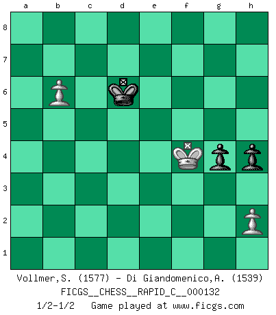 Last move : 1/2-1/2 2016 July 6 16:17:55 [Event "FICGS__CHESS__RAPID_C__000132"] [Site "FICGS"] [Date "2016.03.15"] [Round "1"] [White "Vollmer,Steve"] [Black "Di Giandomenico,Alfonso"] [Result "1/2-1/2"] [WhiteElo "1577"] [BlackElo "1539"] 1.Nf3 c5 2.e4 d6 3.d4 cxd4 4.Nxd4 Nf6 5.Nc3 g6 6.Bc4 Bg7 7.O-O O-O 8.Bb3 Nbd7 9.f3 a6 10.Be3 Nc5 11.Qd2 Nxb3 12.Nxb3 b5 13.Bd4 Bb7 14.Rac1 Rc8 15.Nd5 e6 16.Nxf6+ Bxf6 17.Bxf6 Qxf6 18.c3 d5 19.exd5 Bxd5 20.Nd4 Rfd8 21.Qf2 Rc7 22.a3 Rcd7 23.f4 Re8 24.g4 e5 25.Rce1 Rde7 26.fxe5 Qxf2+ 27.Rxf2 Rxe5 28.Rxe5 Rxe5 29.Nf3 Re7 30.Nd4 Re1+ 31.Rf1 Rxf1+ 32.Kxf1 f6 33.Kf2 Kf7 34.Ke3 Ke7 35.Kf4 h6 36.Ke3 Kd6 37.b4 Ke5 38.Ne2 Be4 39.Nd4 f5 40.gxf5 Bxf5 41.Nxf5 Kxf5 42.c4 bxc4 43.Kd4 c3 44.Kxc3 Ke5 45.a4 g5 46.b5 axb5 47.axb5 g4 48.b6 Kd6 49.Kd4 h5 50.Ke4 h4 51.Kf4 1/2-1/2 Reti Opening Kingside Castling by player White (move 7) Kingside Castling by player Black (move 7) 10 pieces endgame at move 41 : White KPPPP , Black KPPPP WHITE : King + 4 Pawns BLACK : King + 4 Pawns 9 pieces endgame at move 42 : White KPPP , Black KPPPP WHITE : King + 3 Pawns BLACK : King + 4 Pawns 8 pieces endgame at move 44 : White KPPP , Black KPPP WHITE : King + 3 Pawns BLACK : King + 3 Pawns 7 pieces endgame at move 46 : White KPP , Black KPPP WHITE : King + 2 Pawns BLACK : King + 3 Pawns 6 pieces endgame at move 47 : White KPP , Black KPP WHITE : King + 2 Pawns BLACK : King + 2 Pawns This chess game ended in a draw. Follow this game move after move (download)Without error there can be no brilliancy. (Emanuel Lasker) Das Schachspiel ist ein See, in welchem eine Mücke baden und ein Elefant ertrinken kann. (Emanuel Lasker) Fischer era un maestro de claridad y un Rey del posicionamiento astuto. Sus oponentes podían ver hacia donde se dirigía pero eran impotentes para detenerlo. (Bruce Pandolfini) Le plus grand jeu de l'esprit jamais inventé, plus vous l'apprenez, plus vous y prenez du plaisir. (Garry Kasparov) War is the child of passion, passion is the child of narcissism and narcissism is the child. (...) Another game ? (Thibault de Vassal)