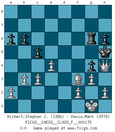 Last move : 1-0 2016 August 13 22:12:37 [Event "FICGS__CHESS__CLASS_F__000175"] [Site "FICGS"] [Date "2016.03.19"] [Round "1"] [White "Hilbert,Stephan J."] [Black "Davis,Mark"] [Result "1-0"] [WhiteElo "1386"] [BlackElo "0973"] 1.Nf3 d5 2.e4 dxe4 3.Ng5 Nc6 4.Bc4 e6 5.Nxe4 Bb4 6.O-O Nf6 7.Nbc3 O-O 8.Nxf6+ Qxf6 9.Ne4 Qh4 10.d3 f5 11.Ng5 Re8 12.c3 Be7 13.Nxe6 Bxe6 14.Bxe6+ Kh8 15.Bxf5 Bd6 16.Bh3 Ne5 17.Be3 b6 18.d4 Nc4 19.Qc1 Qe4 20.g3 Rf8 21.Bg2 Rf3 22.Bxf3 Qe8 23.Re1 Rb8 24.Bf4 Qf8 25.Bg2 Bxf4 26.Qxf4 Qg8 27.b3 Nd6 28.Re2 Rf8 29.Qg5 h6 30.Qh5 Rf5 31.Qh4 Rf6 32.Rae1 g5 33.Qh5 a6 34.Re8 Nxe8 35.Rxe8 Qxe8 36.Qxe8+ Kg7 37.Qe5 c5 38.Qc7+ Kg6 39.Be4+ Kh5 40.Qe7 Rg6 41.Bf3+ g4 42.Qh4+ 1-0 Tennison (Lemberg, Zukertort) gambit Kingside Castling by player White (move 6) Kingside Castling by player Black (move 7) Player White won this chess game. Follow this game move after move (download)When you don't know what to do, wait for your opponent to get an idea - it's sure to be wrong. (Tarrasch) Smyslow ist ein Beweis dafür, dass ich noch zehn Jahre spielen kann! [der 75 jährige über den 85 jährigen] (Viktor Kortschnoi) Un Peón pasado es un criminal, quién debe ser mantenido bajo candado y llave. Leves medidas, tales como vigilancia policiaca, no son suficientes. (Aaron Nimzovich) Si je n'étais pas joueur d'échecs, je serais le meilleur dans quelque chose d'autre. (Anatoli Karpov) Perseverance does not equal worthiness. Next time you want to get my attention, wear something fun. Low-riding jeans are hot. (Gregory House, House M.D.)