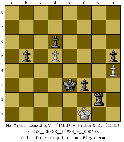 Last move : 0-1 2016 July 23 0:32:55 [Event "FICGS__CHESS__CLASS_F__000175"] [Site "FICGS"] [Date "2016.03.19"] [Round "1"] [White "Martinez Camacho,Victor Hugo"] [Black "Hilbert,Stephan J."] [Result "0-1"] [WhiteElo "1183"] [BlackElo "1386"] 1.e4 e5 2.Nf3 Nf6 3.Nxe5 d6 4.Nf3 Be7 5.d4 Nxe4 6.c4 O-O 7.Bd3 Nf6 8.O-O Bg4 9.Nc3 Nc6 10.h3 Bh5 11.Be3 Nb4 12.Be2 Bg6 13.a3 Nc6 14.b4 Ne4 15.Nxe4 Bxe4 16.Nh2 Bg5 17.Bf3 Bxe3 18.fxe3 Qe7 19.Bxe4 Qxe4 20.Qd2 Rae8 21.Rae1 f5 22.Qa2 Kh8 23.b5 Na5 24.Rf4 Qd3 25.Qf2 Nxc4 26.a4 Nxe3 27.Qf3 Qc3 28.Re2 Qc1+ 29.Nf1 Nxf1 30.Qxf1 Qxf1+ 31.Rxf1 Rxe2 32.a5 g5 33.Rc1 Rf7 34.b6 cxb6 35.axb6 axb6 36.Rb1 Rc7 37.Rxb6 Rd7 38.d5 h5 39.Kf1 Rd2 40.Rb5 Kg7 41.g3 Rc7 42.Rb1 b5 43.h4 gxh4 44.gxh4 f4 45.Re1 Kf6 46.Kg1 Re7 47.Rf1 Kf5 48.Rb1 Rg7+ 49.Kf1 Rh2 50.Re1 Rh1+ 51.Kf2 Rxe1 52.Kxe1 Rg2 53.Kf1 f3 54.Ke1 Ke4 55.Kf1 Ke3 0-1 Petrov's defense Kingside Castling by player Black (move 6) Kingside Castling by player White (move 8) 10 pieces endgame at move 51 : White KPP , Black KRRPPPP WHITE : King + 2 Pawns BLACK : King + 2 Rooks 4 Pawns 9 pieces endgame at move 52 : White KPP , Black KRPPPP WHITE : King + 2 Pawns BLACK : King + 1 Rook 4 Pawns Player Black won this chess game. Follow this game move after move (download)Fischer sacrificed virtually everything most of us weakies (to use his term) value, respect, and cherish, for the sake of an artful, often beautiful board game, for the ambivalent privilege of being its greatest master. (Paul Kollar) Ich las kürzlich ein Buch von Nietzsche. Er sagte Religion verdumme nur die Menschen. Ich stimme zu. (Robert James Fischer) El Ajedrez es una hermosa aventura. (Bent Larsen) Tous ces prétendus hommes politiques sont les pions, les Cavaliers, les Tours ou les Fous d'une partie d'échecs qui se jouera tant qu'un hasard ne renversera pas l'échiquier. (Honoré de Balzac) The ego is not master in its own house. (Sigmund Freud)