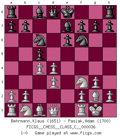 Last move : 1-0 2007 May 11 8:39:23 [Event "FICGS__CHESS__CLASS_C__000036"] [Site "FICGS"] [Date "2007.03.24"] [Round "1"] [White "Behrmann,Klaus"] [Black "Pasiak,Adam"] [Result "1-0"] [WhiteElo "1651"] [BlackElo "1700"] 1.Nf3 d5 2.g3 c5 3.Bg2 Nc6 4.O-O e6 5.c4 d4 6.d3 Nf6 7.e3 Be7 8.exd4 1-0 This chess game has been lost on time (started : 2007.03.24 22:8:4) Reti : King's Indian attack Kingside Castling by player White (move 4) Player White won this chess game. Follow this game move after move (download)The isolated Pawn casts gloom over the entire chessboard. (Aaron Nimzovich) Das Schachspiel ist ein See, in welchem eine Mücke baden und ein Elefant ertrinken kann. (Emanuel Lasker) Solo los afeminados hacen el Enroque. (Rob Sillars) Le plus grand jeu de l'esprit jamais inventé, plus vous l'apprenez, plus vous y prenez du plaisir. (Garry Kasparov) Life is like internet, nothing interesting, but noone want to leave it. (Ilmars Cirulis)