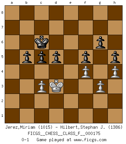 Last move : 0-1 2016 October 28 2:15:10 [Event "FICGS__CHESS__CLASS_F__000175"] [Site "FICGS"] [Date "2016.03.19"] [Round "1"] [White "Jerez,Miriam"] [Black "Hilbert,Stephan J."] [Result "0-1"] [WhiteElo "1015"] [BlackElo "1386"] 1.e4 e5 2.Nf3 Nf6 3.Nc3 Bc5 4.Bc4 O-O 5.O-O d6 6.d4 exd4 7.Nxd4 Bg4 8.Qd3 Nc6 9.h3 Bd7 10.Nxc6 Bxc6 11.a3 Qe7 12.b4 Bb6 13.Be3 Nxe4 14.Nxe4 Qxe4 15.Qxe4 Bxe4 16.Bxb6 axb6 17.c3 Ra7 18.Rfe1 d5 19.Bb3 c6 20.f3 Bd3 21.Re3 Bf5 22.Kh2 h5 23.Rae1 Rxa3 24.Bd1 Be6 25.Bc2 Rfa8 26.f4 g6 27.h4 Ra2 28.Bb3 Ra1 29.Bc2 R1a2 30.Bb3 Rb2 31.Bd1 R8a2 32.R1e2 Rxe2 33.Rxe2 Rxe2 34.Bxe2 f5 35.g3 Kf7 36.Kg2 Ke7 37.Kf3 Kd6 38.Bd3 c5 39.Bb5 Bd7 40.Bxd7 Kxd7 41.bxc5 bxc5 42.Ke3 Kc6 43.Kd3 b5 0-1 Petrov Three knights game Kingside Castling by player Black (move 4) Kingside Castling by player White (move 5) Player Black won this chess game. Follow this game move after move (download)I won't play with you anymore. You have insulted my friend. - When an opponent cursed himself for a blunder. (Miguel Najdorf) Das Zentrum ist der Balkan des Schachbretts - Kriegshandlungen können in jedem Moment ausbrechen. (Aaron Nimzowitsch) Las combinaciones han sido siempre el aspecto más intrigante del Ajedrez. Los Maestros las buscan, el público las aplauden, los críticos las alaban. La razón se debe a que las combinaciones hacen posible que el Ajedrez sea más que un ejercicio matemático con una carencia de vida. Ellas son la poesía del juego, son del Ajedrez lo que la melodía es de la música. Ellas representan el triunfo de la mente sobre la materia. (Reuben Fine) Il s'avisa de me proposer d'apprendre les échecs qu'il jouait un peu... me voilà forcené des échecs. J'achète un échiquier, je m'enferme dans ma chambre, j'y passe des jours et des nuits à vouloir apprendre par cur toutes les parties. (Jean-Jacques Rousseau, Confessions) Programming can only do so much before it becomes too much. (Don Groves)