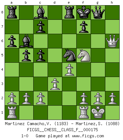 Last move : 1-0 2016 September 5 9:40:50 [Event "FICGS__CHESS__CLASS_F__000175"] [Site "FICGS"] [Date "2016.03.19"] [Round "1"] [White "Martinez Camacho,Victor Hugo"] [Black "Martinez,Silvio"] [Result "1-0"] [WhiteElo "1183"] [BlackElo "1088"] 1.e4 e5 2.Nf3 Nc6 3.Bb5 Nf6 4.d3 Bc5 5.O-O O-O 6.Nc3 a6 7.Bxc6 dxc6 8.Bd2 b5 9.Ne2 h6 10.Nxe5 Bb7 11.Qc1 Re8 12.Nf3 Bb6 13.Ng3 c5 14.Bxh6 gxh6 15.Qxh6 Ng4 16.Qh5 Bc8 17.Ng5 Ne5 18.Qh7+ Kf8 19.Nf5 Qxg5 20.Qh8+ Qg8 21.Qh6+ 1-0 Ruy Lopez : Berlin defense Kingside Castling by player White (move 5) Kingside Castling by player Black (move 5) Player White won this chess game. Follow this game move after move (download)You have to have the fighting spirit. You have to force moves and take chances. (Bobby Fischer) Matt entspricht nicht immer den Tatsachen. (Savielly Grigorievitsch Tartakower) Las piezas de Ajedrez son los bloques del alfabeto que moldean los pensamientos; y esos pensamientos, aunque hagan un diseño visual en el tablero, expresan abstractamente su belleza como un poema. (Marcel Duchamp) Botvinnik disait en comparant les échecs à la musique: Il existe une science dont le but est l'étude de l'acoustique et des sons. Mais il y a aussi un art qui se sert de l'océan des sons : c'est la musique. De toute évidence, il en est de même pour la pensée. La logique est l'étude des lois de la réflexion et les échecs reflètent, en tant qu'art, le côté logique de la réflexion, sous la forme d'images artistiques... Extrait de Fischer - Spassky, Reykjavik 1972 par Alexander & F. Wyndham (Ed. Solar), p 37. A good programmer is someone who always looks both ways before crossing a one-way street. (Doug Linder)