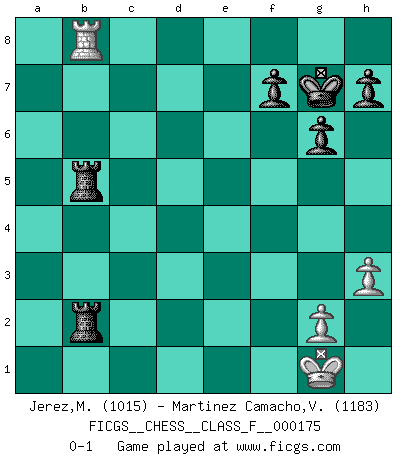 Last move : 0-1 2016 December 3 19:29:57 [Event "FICGS__CHESS__CLASS_F__000175"] [Site "FICGS"] [Date "2016.03.19"] [Round "1"] [White "Jerez,Miriam"] [Black "Martinez Camacho,Victor Hugo"] [Result "0-1"] [WhiteElo "1015"] [BlackElo "1183"] 1.e4 e5 2.Nf3 Nc6 3.Bb5 a6 4.Ba4 Nf6 5.O-O d6 6.Nc3 Bd7 7.d4 Nxd4 8.Nxd4 Bxa4 9.b3 exd4 10.Qxd4 Bd7 11.h3 Be7 12.Ba3 O-O 13.Nd5 Nxd5 14.Qxd5 Bc6 15.Qd3 Re8 16.Rfe1 Bf6 17.Rad1 Be5 18.c4 Qf6 19.Re2 Qg5 20.Bc1 Qg6 21.Qf3 b5 22.cxb5 Bxb5 23.Rc2 c5 24.a4 Bd7 25.Bf4 Qe6 26.Rcd2 Bxf4 27.Qxf4 Qxe4 28.Qxd6 Bc6 29.f3 Qg6 30.Qxc5 Rac8 31.Qa7 Bxf3 32.Kf1 Bxd1 33.Rxd1 Qf5+ 34.Kg1 Rc2 35.Rf1 Qe6 36.b4 Qe3+ 37.Qxe3 Rxe3 38.b5 axb5 39.axb5 Rb2 40.Rf5 g6 41.Rd5 Reb3 42.Rd8+ Kg7 43.Rb8 Rxb5 0-1 Ruy Lopez : Steinitz defense deferred (Russian defense) Kingside Castling by player White (move 5) Kingside Castling by player Black (move 12) 10 pieces endgame at move 43 : White KRPP , Black KRRPPP WHITE : King + 1 Rook 2 Pawns BLACK : King + 2 Rooks 3 Pawns Player Black won this chess game. Follow this game move after move (download)No Chess Grandmaster is normal; they only differ in the extent of their madness. (Viktor Korchnoi) Bis zum Jahr 1971 verlief in meiner Schachkariere alles glatt. Dieses dramatische Match [Fischer-Taimanov 6:0] machte mein Leben zur Hölle. (Mark Taimanov) El ganar no lo es todo... pero el perder es nada. (Mednis) La vérité est comme le meilleur coup aux échecs : elle existe, mais il faut la chercher. (Arturo Perez-Reverte) O divine art of subtlety and secrecy! Through you we learn to be invisible, through you inaudible and hence we can hold the enemy's fate in our hands. (Sun Tzu)