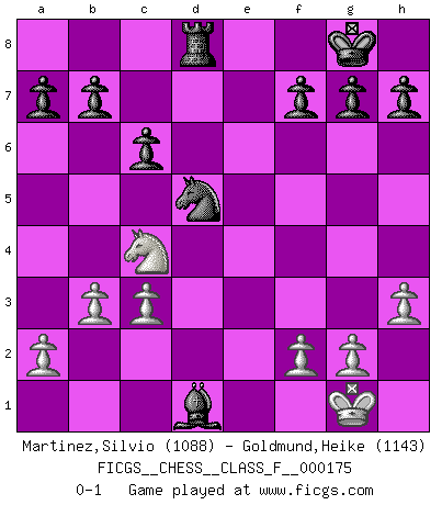 Last move : 0-1 2016 July 27 16:6:30 [Event "FICGS__CHESS__CLASS_F__000175"] [Site "FICGS"] [Date "2016.03.19"] [Round "1"] [White "Martinez,Silvio"] [Black "Goldmund,Heike"] [Result "0-1"] [WhiteElo "1088"] [BlackElo "1143"] 1.e4 d5 2.exd5 Qxd5 3.Nc3 Qa5 4.Nf3 Nf6 5.b3 Bf5 6.Bb2 e5 7.Bc4 c6 8.O-O Nbd7 9.d3 Bb4 10.Qd2 O-O 11.h3 Nb6 12.Qe3 Bxc3 13.Bxc3 Qxc3 14.Qd2 Qxd2 15.Nxd2 Rfd8 16.Rad1 Nxc4 17.Nxc4 e4 18.dxe4 Bxe4 19.c3 Bc2 20.Rd2 Rxd2 21.Nxd2 Rd8 22.Nc4 Nd5 23.Rd1 Bxd1 0-1 Scandinavian (centre counter) defense Kingside Castling by player White (move 8) Kingside Castling by player Black (move 10) Player Black won this chess game. Follow this game move after move (download)Good positions don't win games, good moves do. (Gerald Abrahams) Wie ich sie so einen nach dem anderen nieder mähte wurde meine Überlegenheit offensichtlich. (José Raúl Capablanca) Algunos sacrificios son sólidos, los demás son míos. (Mikhail Tal) Il vaut mieux sacrifier les pièces de l'adversaire. (Xavier Tartacover) Follow your passion, and success will follow you. (Arthur Buddhold)