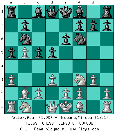 Last move : 0-1 2007 May 18 15:54:10 [Event "FICGS__CHESS__CLASS_C__000036"] [Site "FICGS"] [Date "2007.03.24"] [Round "1"] [White "Pasiak,Adam"] [Black "Hrubaru,Mircea"] [Result "0-1"] [WhiteElo "1700"] [BlackElo "1781"] 1.b4 e6 2.Bb2 Nf6 3.a3 a5 4.b5 c5 5.d3 d5 6.Nf3 Nbd7 7.g3 Nb6 0-1 This chess game has been lost on time (started : 2007.03.24 22:8:4) Polish (Sokolsky) opening Player Black won this chess game. Follow this game move after move (download)What is the object of playing a gambit opening?... To acquire a reputation of being a dashing player at the cost of losing a game. (Siegbert Tarrasch) Im Spitzenschach von heute geht es nur um Vorbereitung, um tiefgründige, sorgfältige Eröffnungsvorbereitung. (Nigel Short) El Ajedrez es un invernadero donde los frutos del carácter pueden madurar mas completamente que en la vida. (Edward Morgan Foster) La tactique est l'élément le plus important du milieu de jeu. (Siegbert Tarrasch) The best weapon against an enemy is another enemy. (Friedrich Nietzsche)