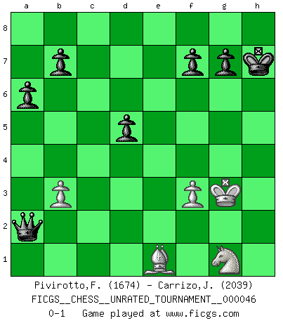 Last move : 0-1 2016 September 1 21:13:3 [Event "FICGS__CHESS__UNRATED_TOURNAMENT__000046"] [Site "FICGS"] [Date "2016.03.19"] [Round "1"] [White "Pivirotto,Filiberto"] [Black "Carrizo,Jose"] [Result "0-1"] [WhiteElo "1674"] [BlackElo "2039"] 1.b3 d5 2.Bb2 Nf6 3.e3 Bf5 4.Nf3 e6 5.Be2 h6 6.O-O c6 7.c4 Nbd7 8.d3 Bd6 9.Nc3 O-O 10.e4 Bg6 11.exd5 exd5 12.cxd5 Nxd5 13.Nxd5 cxd5 14.d4 Re8 15.Bb5 Bh5 16.Rc1 a6 17.Bd3 Qf6 18.Bc3 Nf8 19.h3 Ne6 20.g4 Nf4 21.gxh5 Qe6 22.Re1 Qxh3 23.Bf1 Qg4+ 24.Kh1 Re2 25.Qxe2 Qxh5+ 26.Kg1 Qg4+ 27.Kh1 Nxe2 28.Bxe2 Re8 29.Ng1 Rxe2 30.Rxe2 Qh4+ 31.Kg2 Qg5+ 32.Kh1 Qxc1 33.Bb2 Qf1 34.Bc3 h5 35.f3 h4 36.Re1 Qd3 37.Re8+ Kh7 38.Be1 h3 39.Re2 h2 40.Rxh2+ Bxh2 41.Kxh2 Qxd4 42.Kg2 Qb2+ 43.Kg3 Qxa2 0-1 Nimzovich-Larsen attack : Classical variation Kingside Castling by player White (move 6) Kingside Castling by player Black (move 9) Player Black won this chess game. Follow this game move after move (download)In blitz, the Knight is stronger than the Bishop. (Vlastimil Hort) Ich glaube nicht an Psychologie, ich glaube an gute Züge. (Robert James Fischer) Los tropiezos estan todos ahí en el tablero, esperando que se cometan. (Savielly Tartakover) La solitude du joueur d'Echecs à l'approche du mat est semblable à celle du condamné. (Francis Szpiner) If you lose the game you should win the analysis! (Proverb)